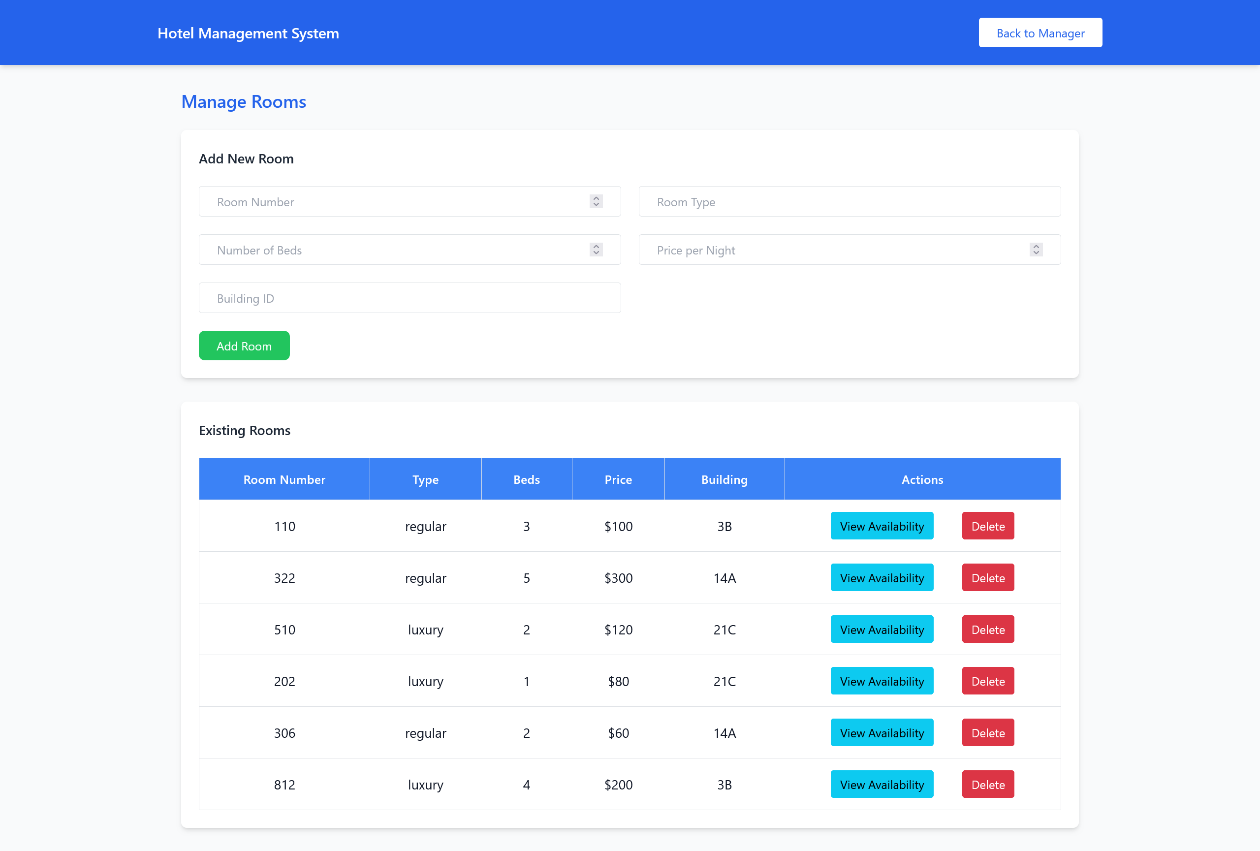 - Логираниот менаџер, со навигација до делот Manage Rooms, пристапува до страната за менаџирање со собите (нивно креирање, бришење и проверка на достапност).