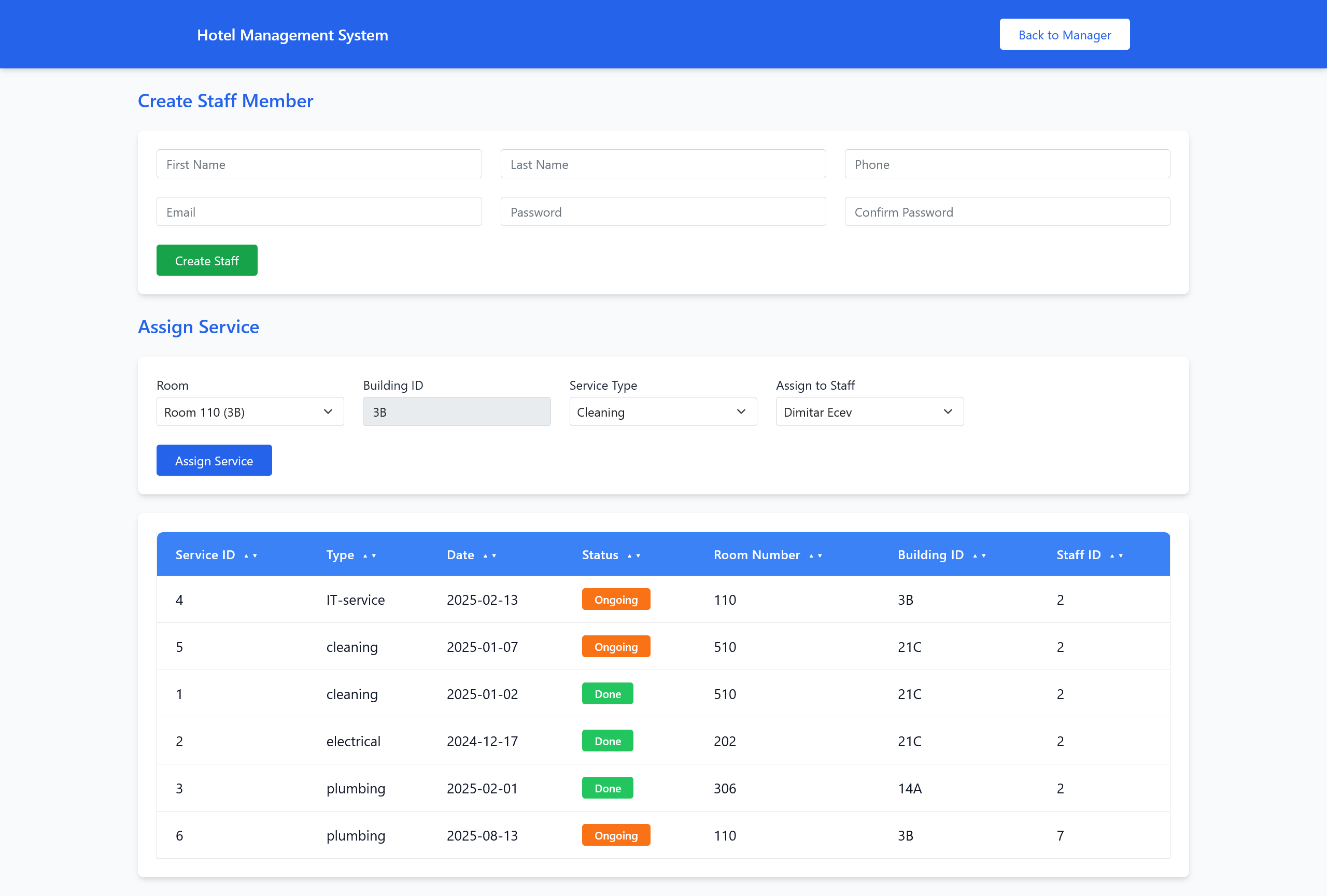 - Кога станува збор за сервисирање на соба, менаџерот доделува сервис и вработен на избраната соба. При избор на соба полето за избор на зграда автоматски се пополнува според изборот на соба.