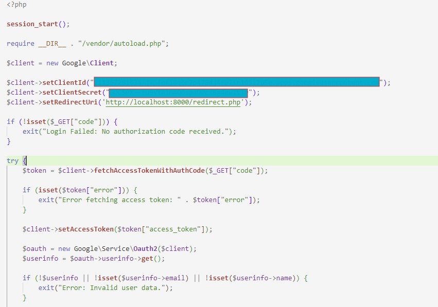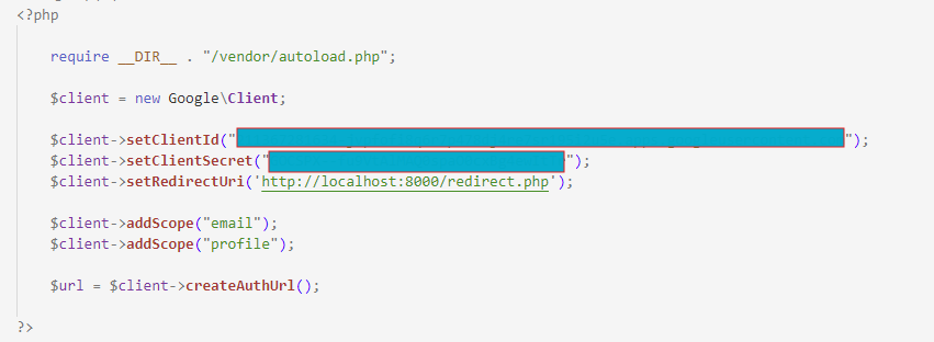 Овој PHP-код поставува автентикација на Google OAuth 2.0 за веб-апликацијата. Го иницијализира објектот Google\Client со ингеренциите на клиентот (ID на клиентот и тајната на клиентот) и одредува URL-адреса за пренасочување за да се справи со одговорот од Google откако корисникот ќе ја овласти апликацијата. Кодот бара пристап до е-поштата на корисникот и основните информации за профилот користејќи го методот addScope. Конечно, генерира URL-адреса за овластување (createAuthUrl()) што го насочува корисникот на страницата за најавување на Google. Откако корисникот ќе се најави и ќе даде дозволи, Google ќе го пренасочи назад кон апликацијата.