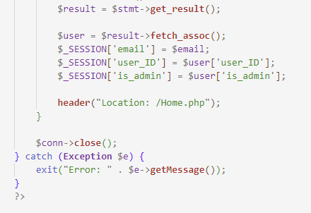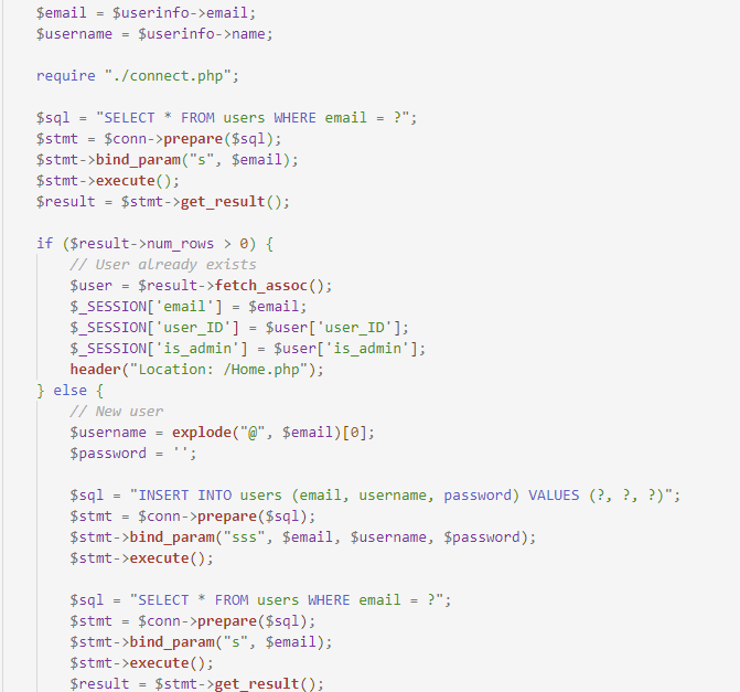Овој PHP-код се справува со автентикација на Google OAuth 2.0 и управување со корисници. Откако корисникот ќе се најави со својата сметка на Google, скриптата го враќа кодот за авторизација од URL-то, го разменува за токен за пристап и го користи токенот за да ги преземе информациите за профилот на корисникот, како што се неговата е-пошта и име. Потоа проверува дали корисникот веќе постои во базата на податоци со барање на неговата е-пошта. Ако корисникот е пронајден, неговата сесија се иницијализира со кориснички податоци и тие се пренасочуваат на почетната страница. Ако корисникот е нов, скриптата создава нов запис во базата на податоци, доделува стандардно корисничко име (врз основа на неговата е-пошта), а потоа ја иницијализира нивната сесија пред да ги пренасочи на почетната страница.
