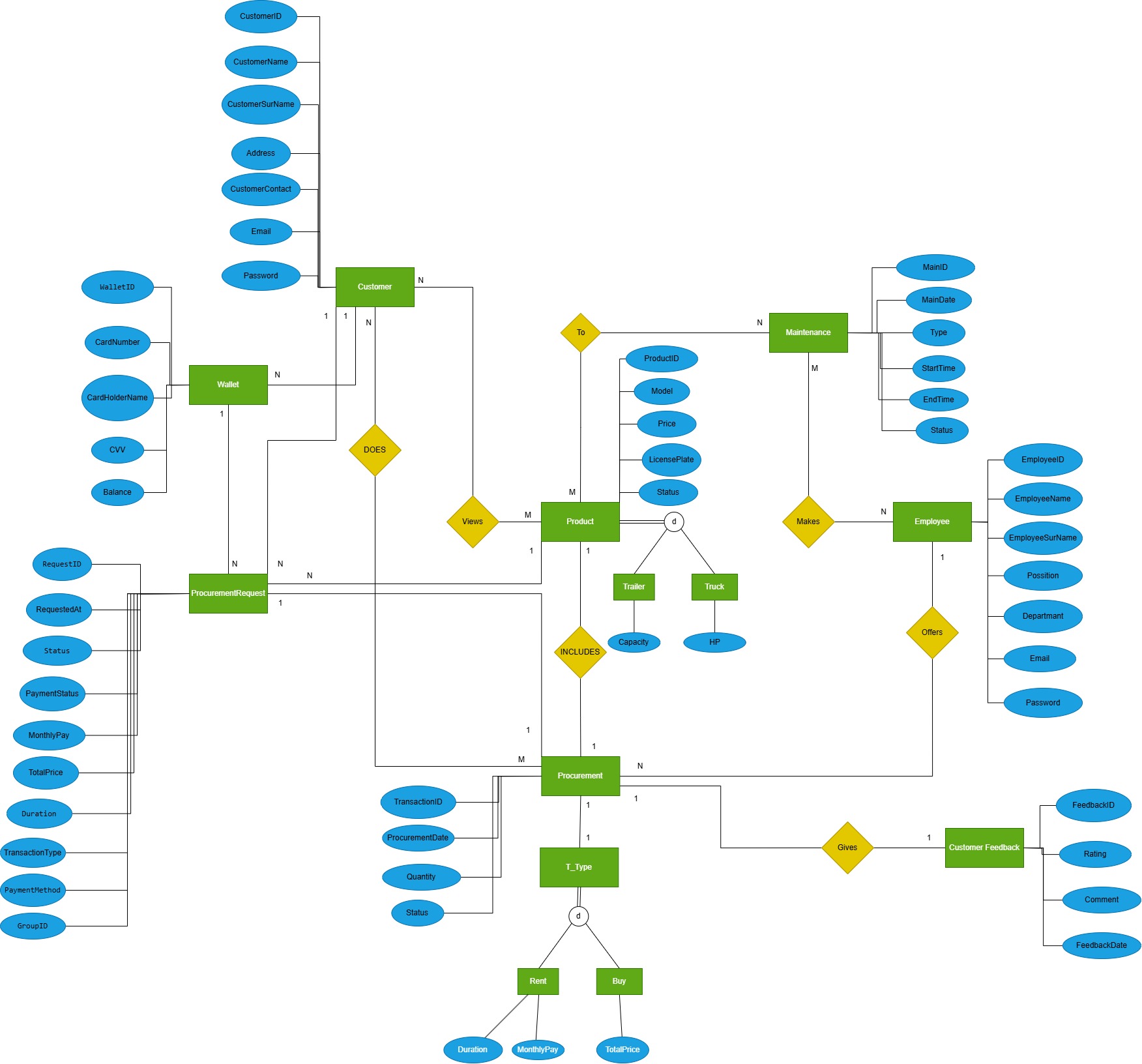 Генерализирачки ентитет со две подкласи: Truck (со HP) и Trailer (со Capacity).