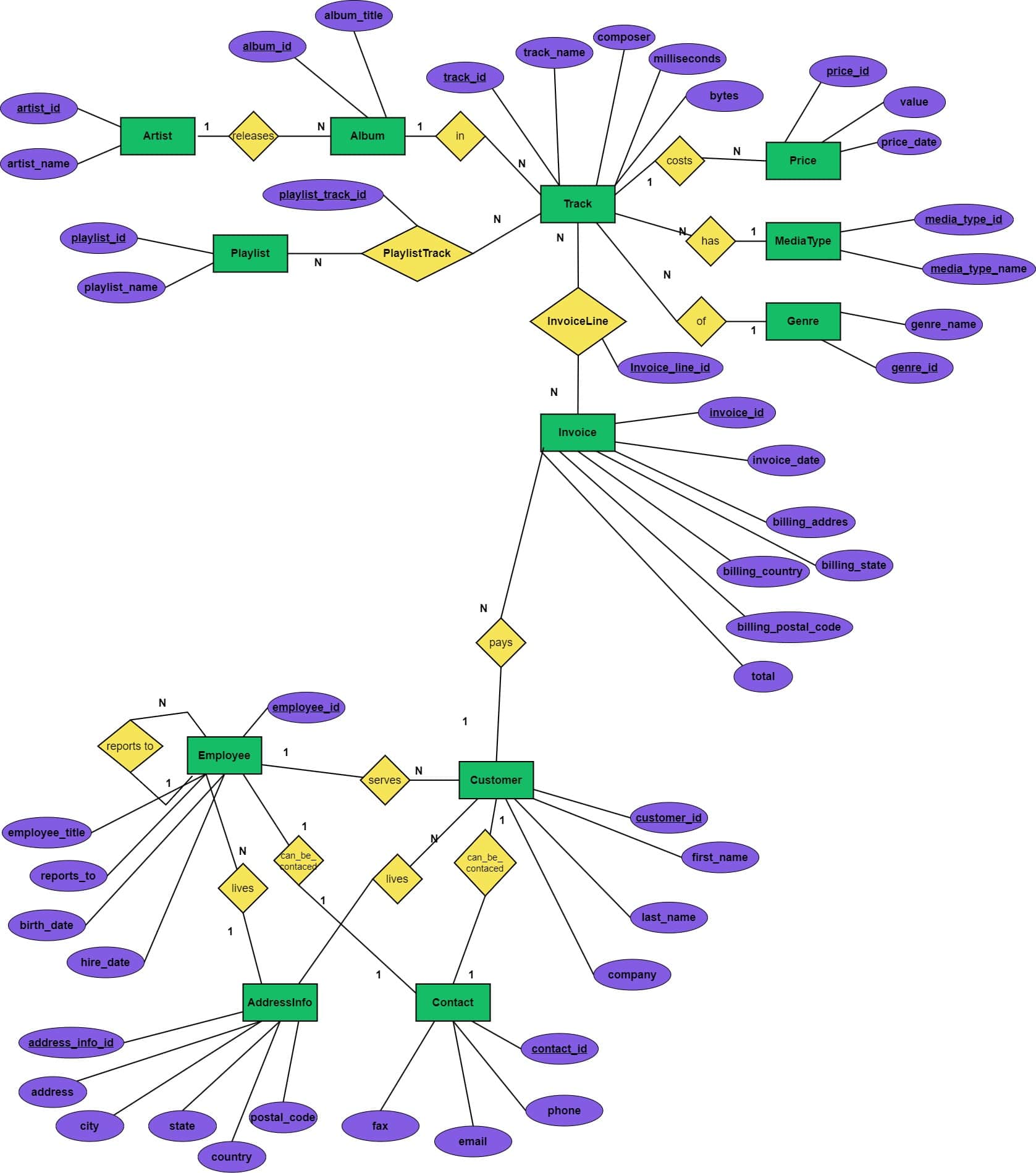 playlist_track – Playlist содржи повеќе Track преку PlaylistTrack, Track може да биде во повеќе Playlist преку PlaylistTrack (релација M:N).