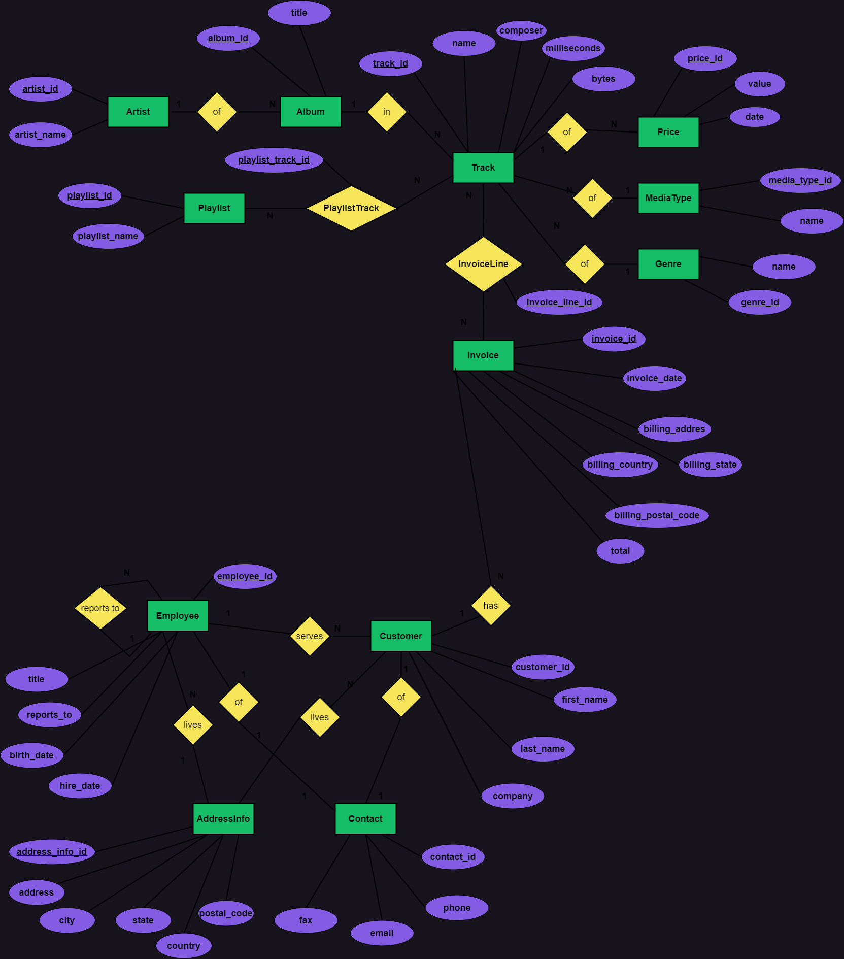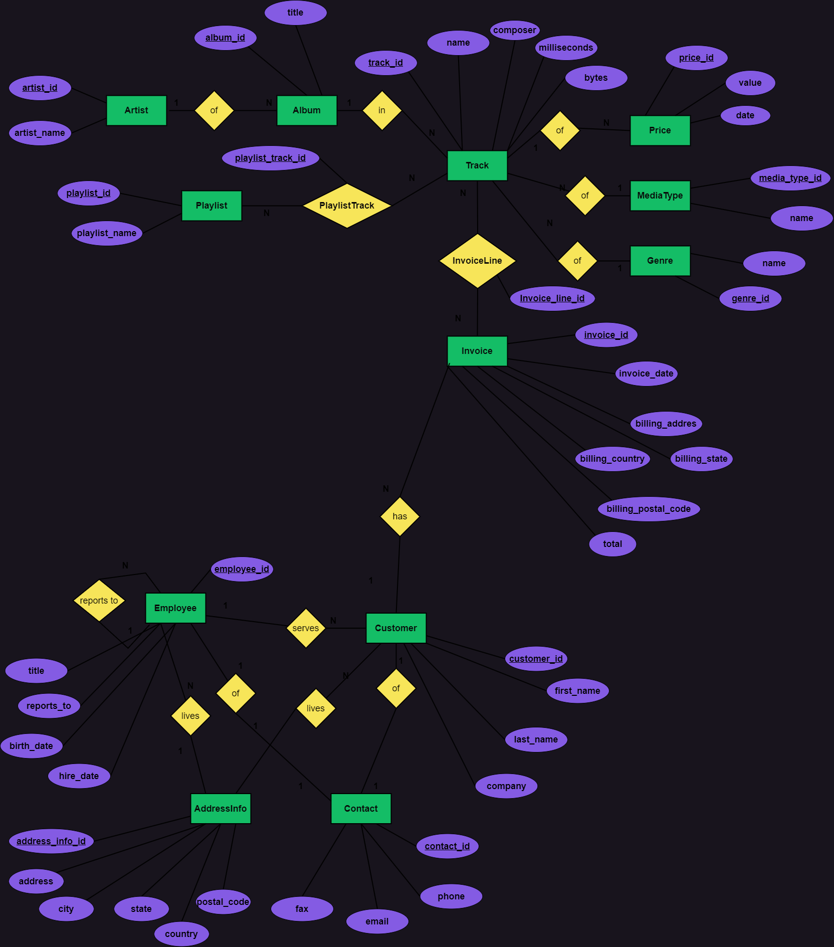 playlist_track – Playlist содржи повеќе Track преку PlaylistTrack, Track може да биде во повеќе Playlist преку PlaylistTrack (релација M:N).