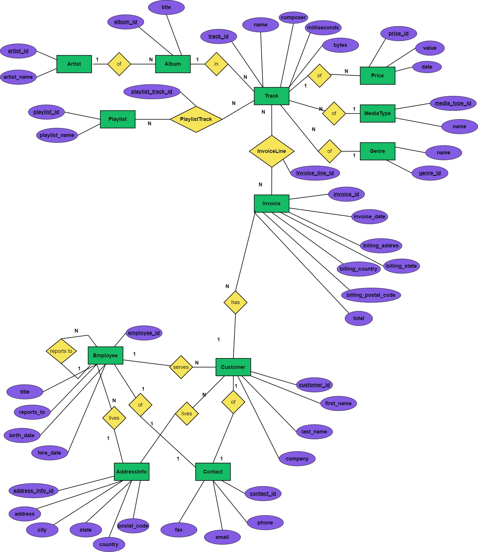 of – Track припаѓа на еден Genre, а еден Genre може да има повеќе Track.