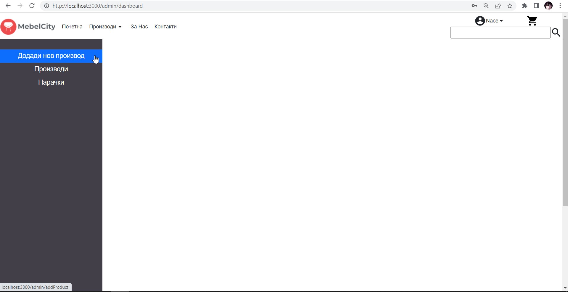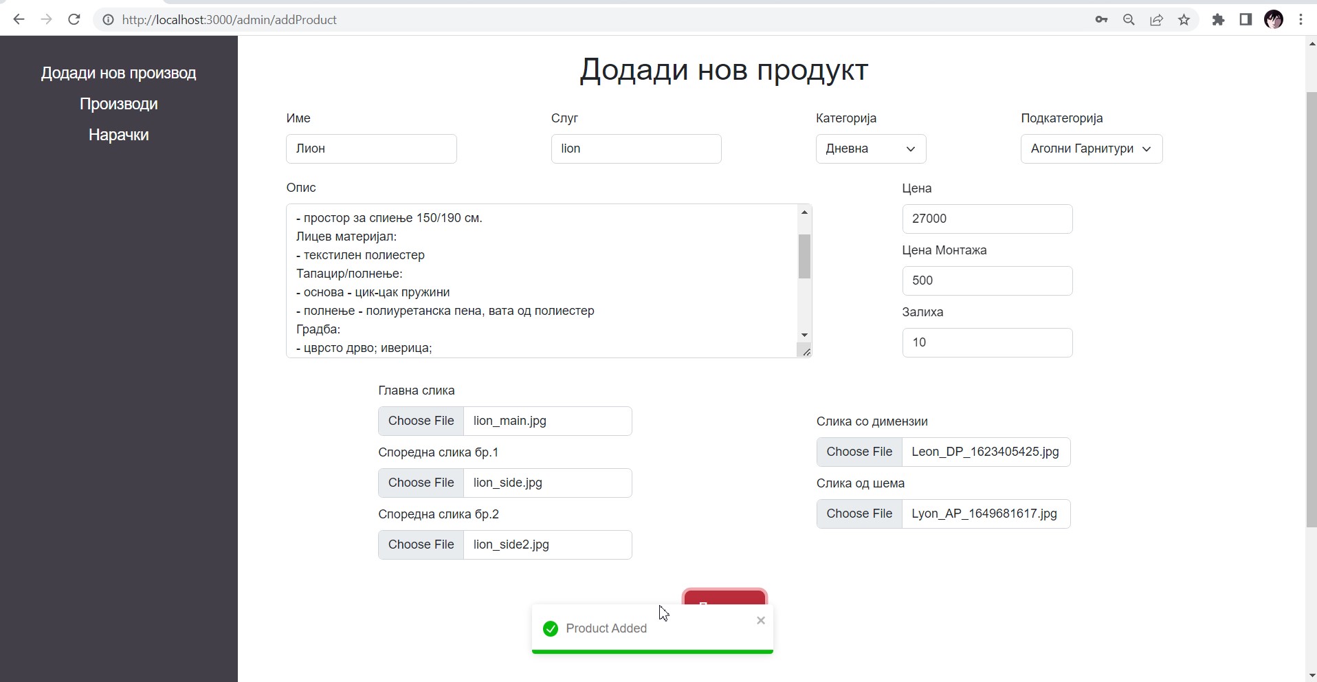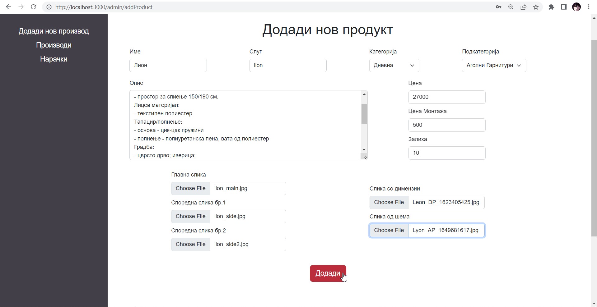 Админот за да додаде нов продукт, најпрво кликнува на „Додади нов производ од менито“, потоа во формата ги потполнува сите информации за производот и кликнува на копчето Додади