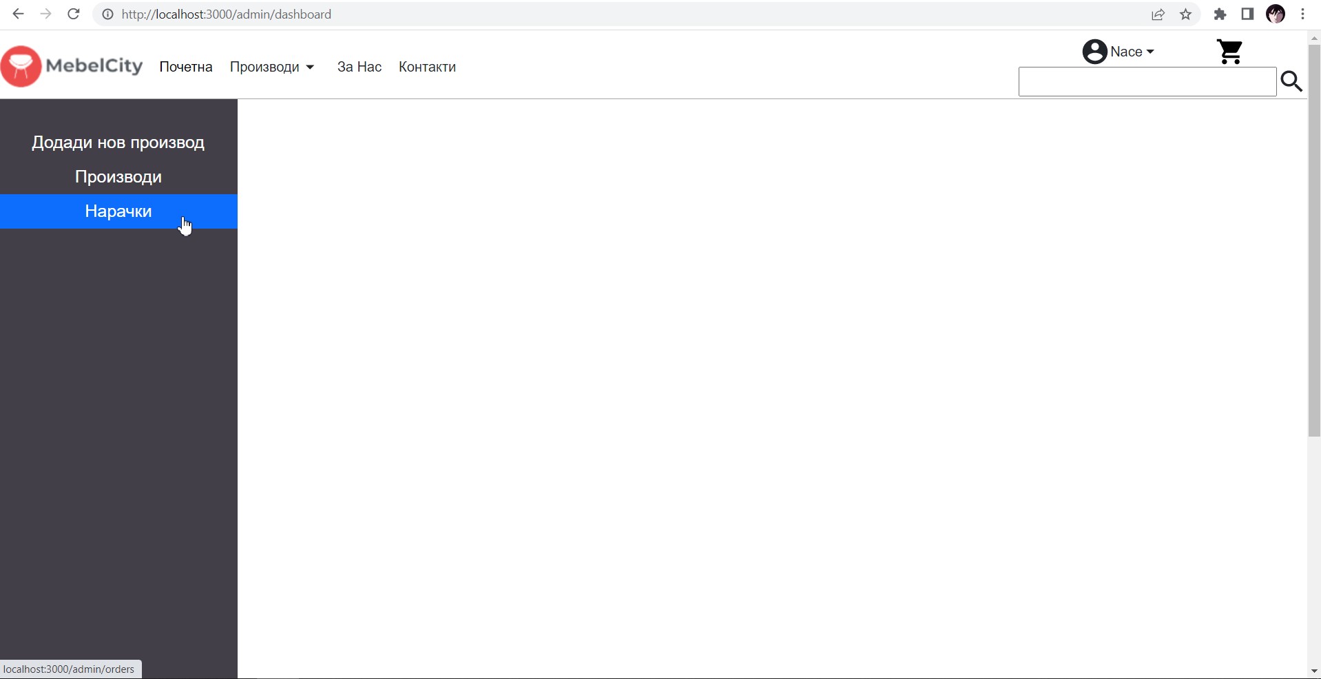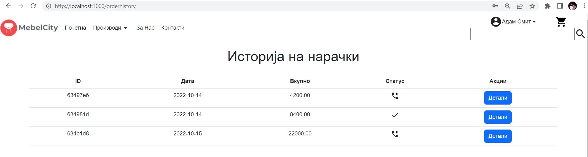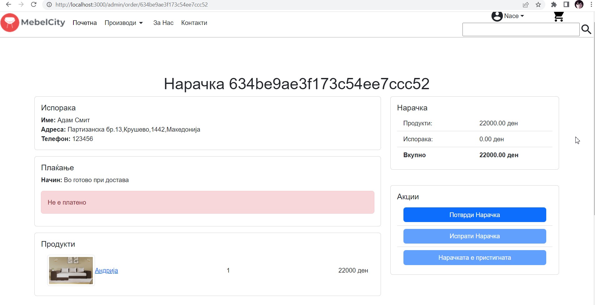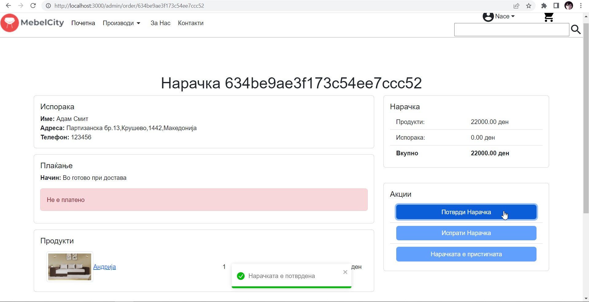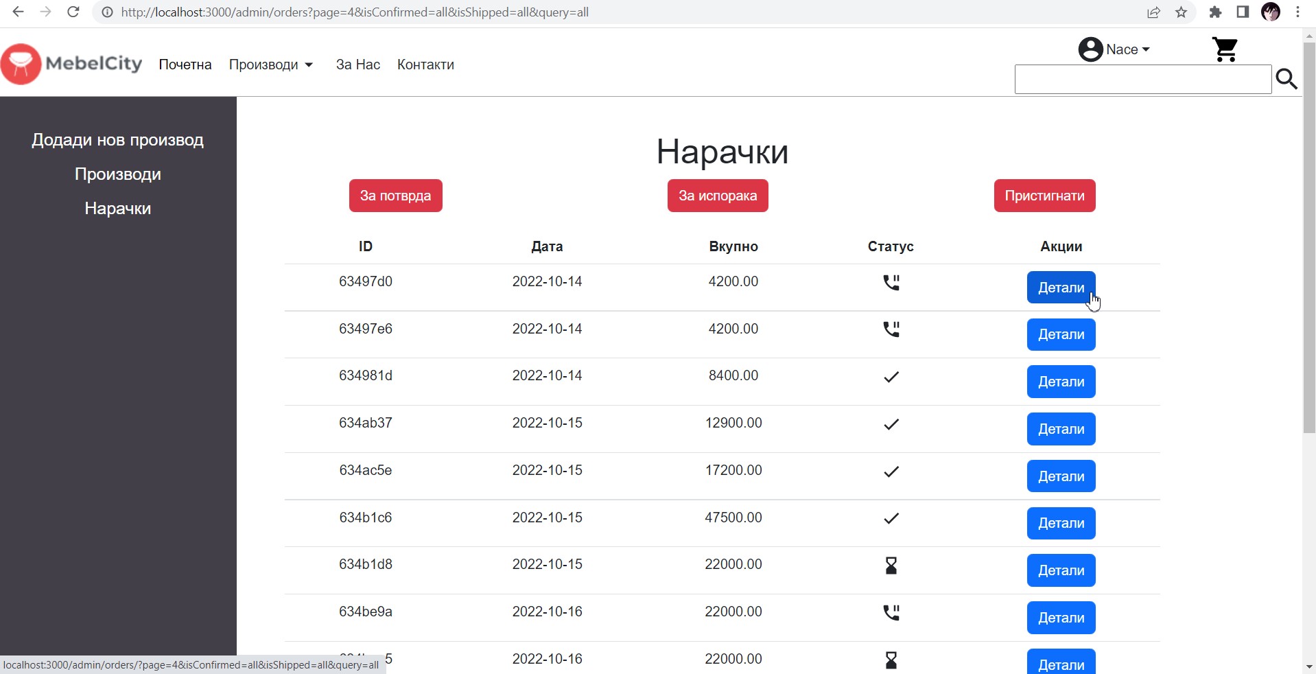 Админот кликнува на „Нарачки“, потоа ја лоцира посакуваната нарачка и кликнува на копчето Детали. Овде админот има три можни акции