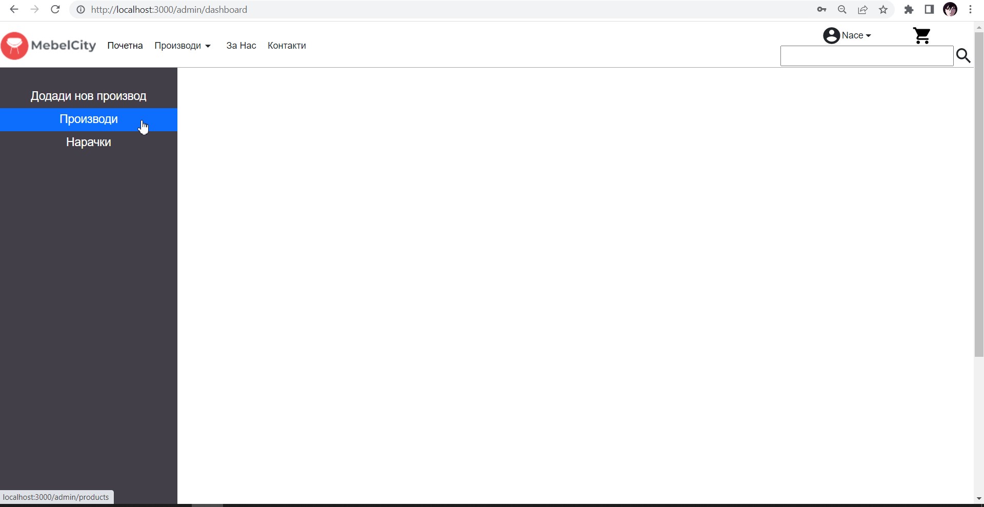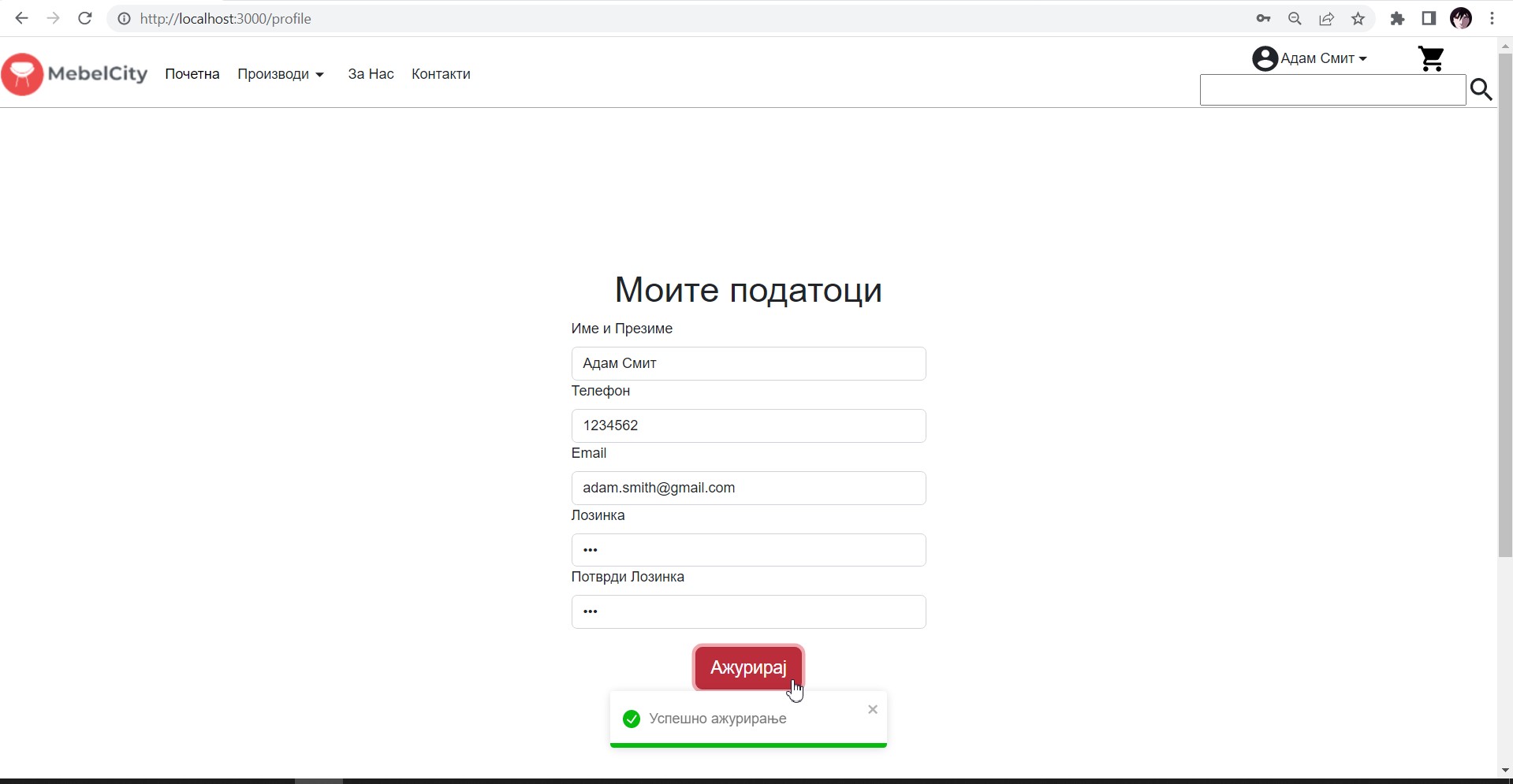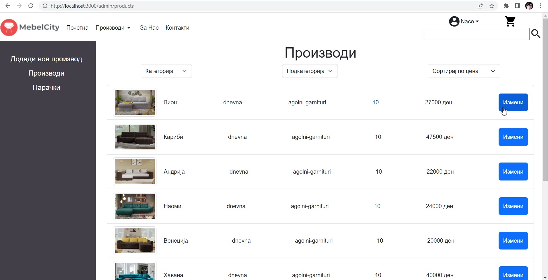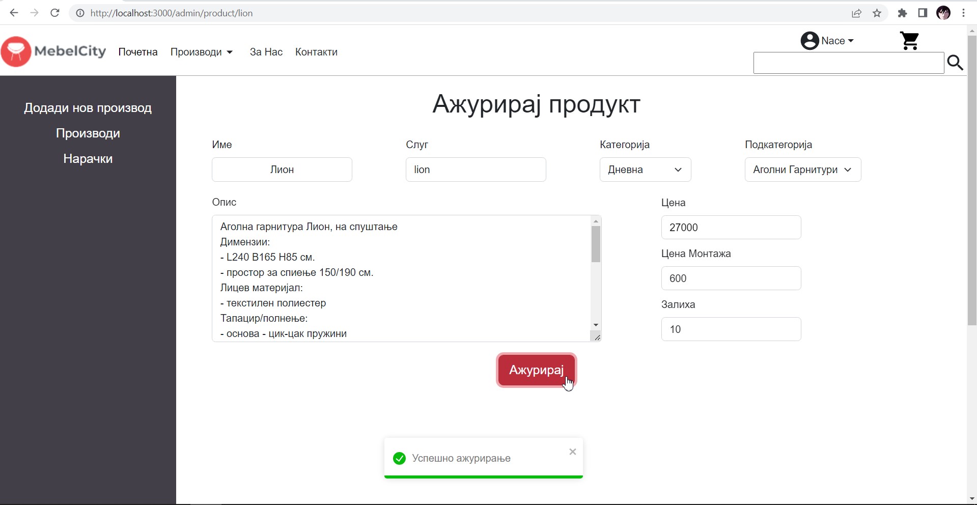 Админот кликнува на „Производи“, потоа го лоцира посакуваниот производ и кликнува на копчето Измени. Во формата ги менува информациите за производот и клика на копчето „Ажурирај“