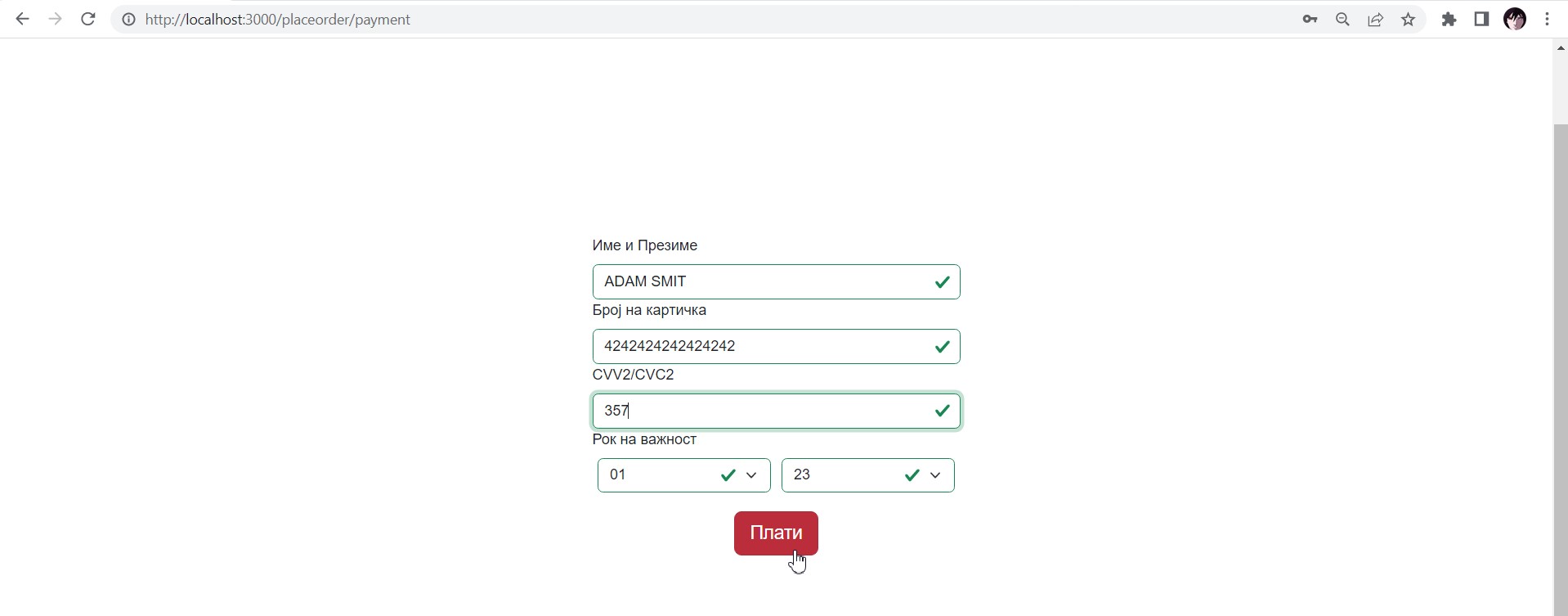 Корисникот наместо плаќање во готово, може да одбере плаќање со картичка. Тогаш при потврда на нарачката тој се префрлува на страна каде извршува уплата