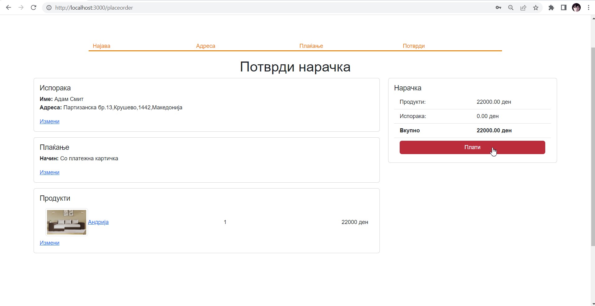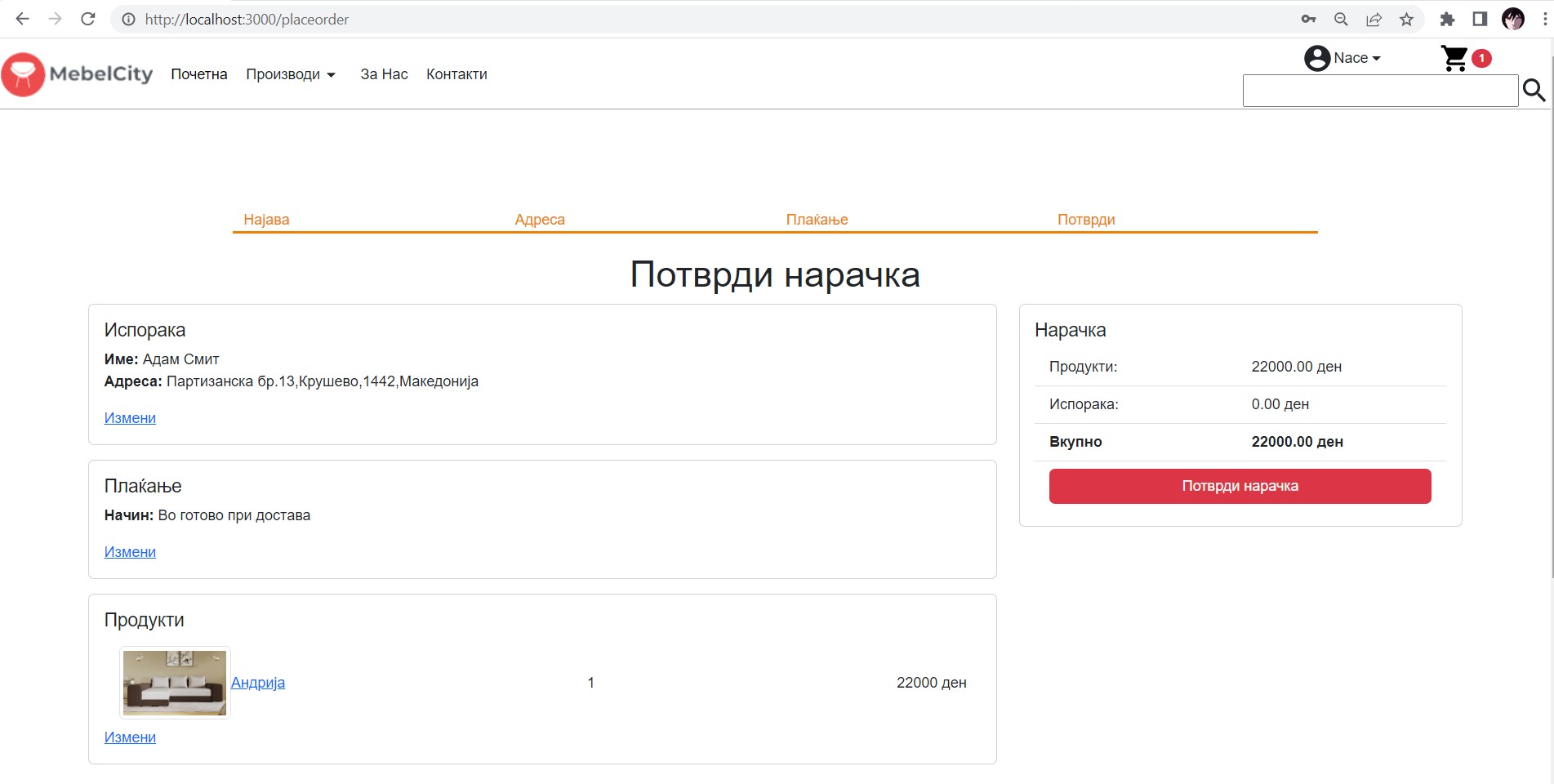 Корисникот има преглед на нарачката и ако сите информации се точни кликнува на копчето „Потврди нарачка“