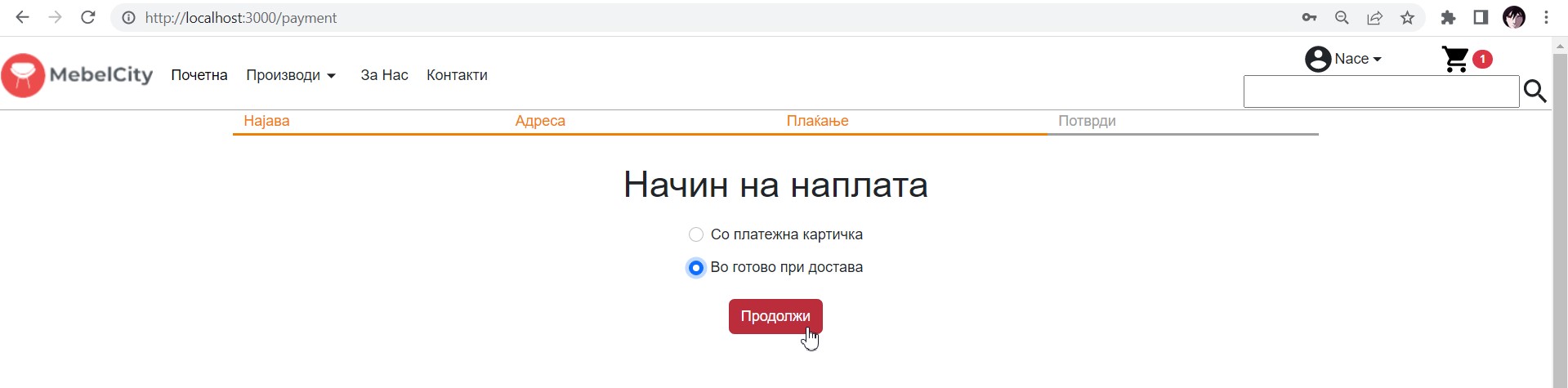 Kорисникот одбира начин на плаќање и кликнува на копчето „Продолжи“