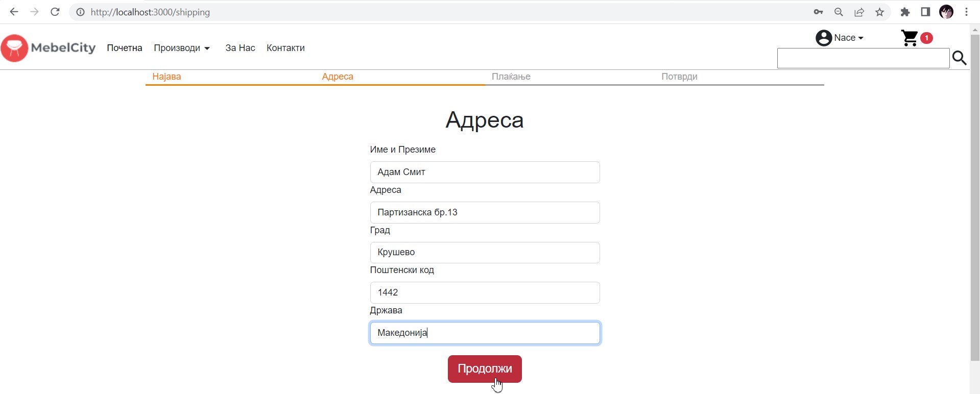 Потоа корисникот треба да ја потполни адресата за достава и да кликне на „Продолжи“