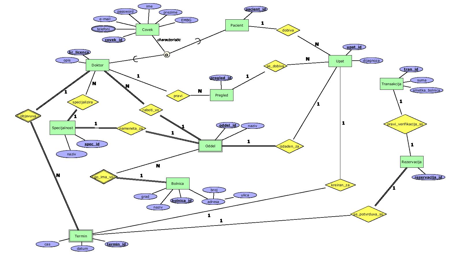 - Oddel - ентитет во кој се чува листа на сите оддели во болниците. Овој е слаб ентитет и е во зависна релација со доктор.