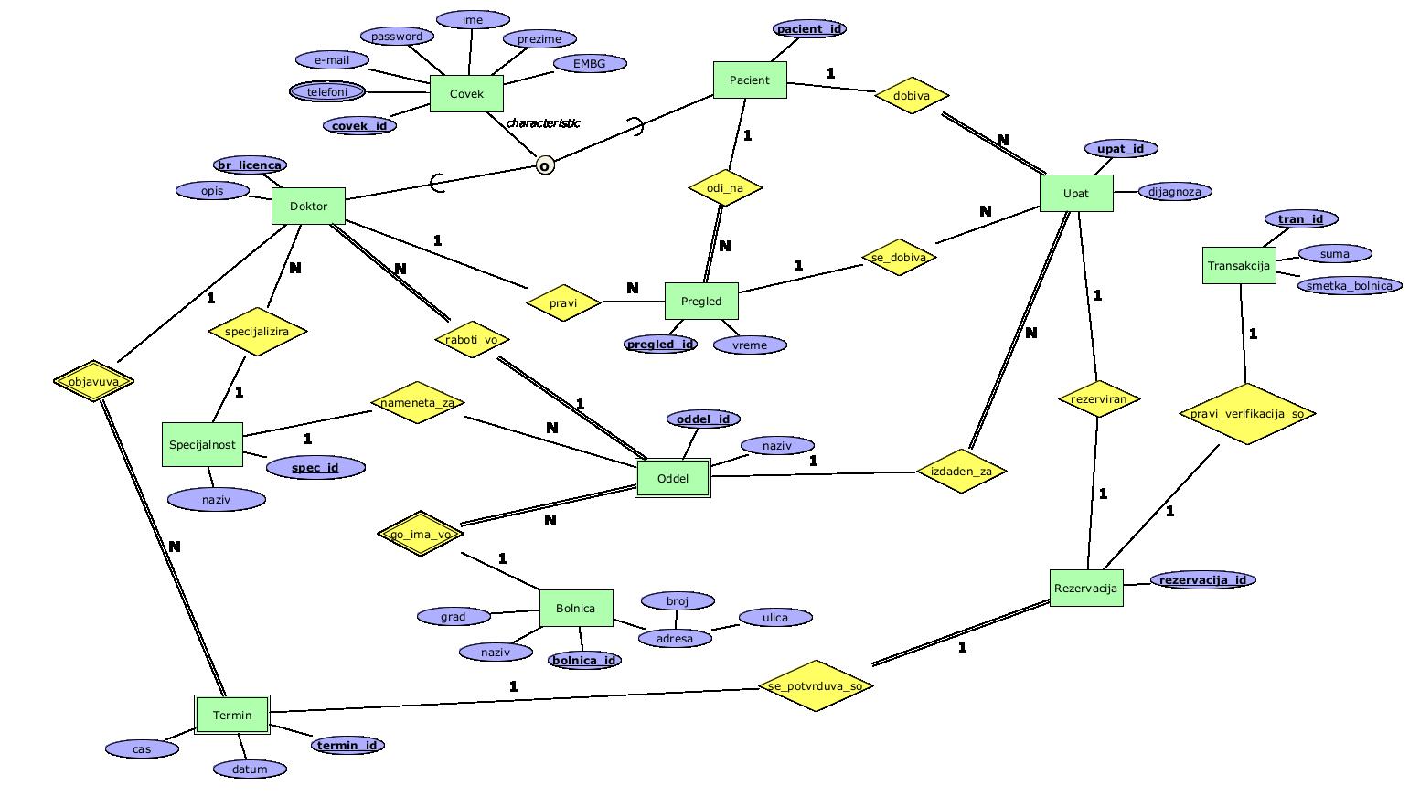 - Oddel - ентитет во кој се чува листа на сите оддели во болниците. Овој е слаб ентитет и е во зависна релација со доктор.
