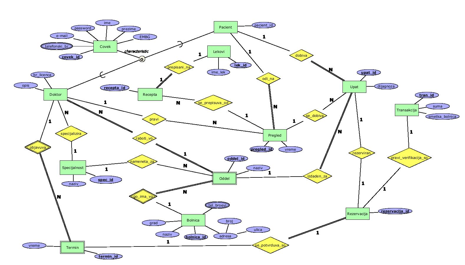 - Oddel - ентитет во кој се чува листа на сите оддели во болниците. Овој е слаб ентитет и е во зависна релација со доктор.