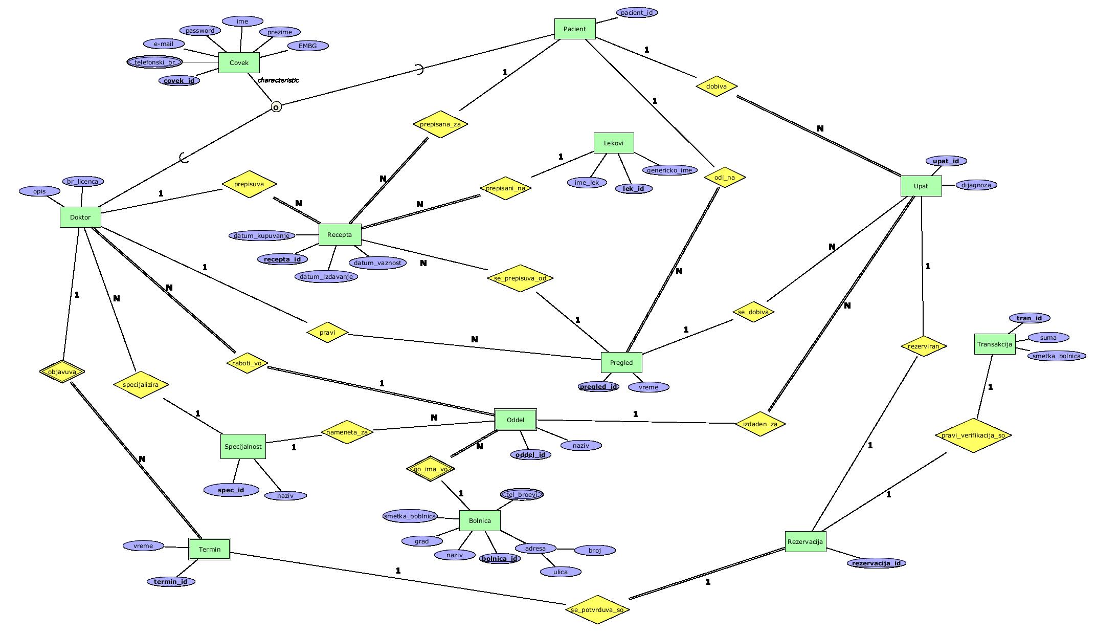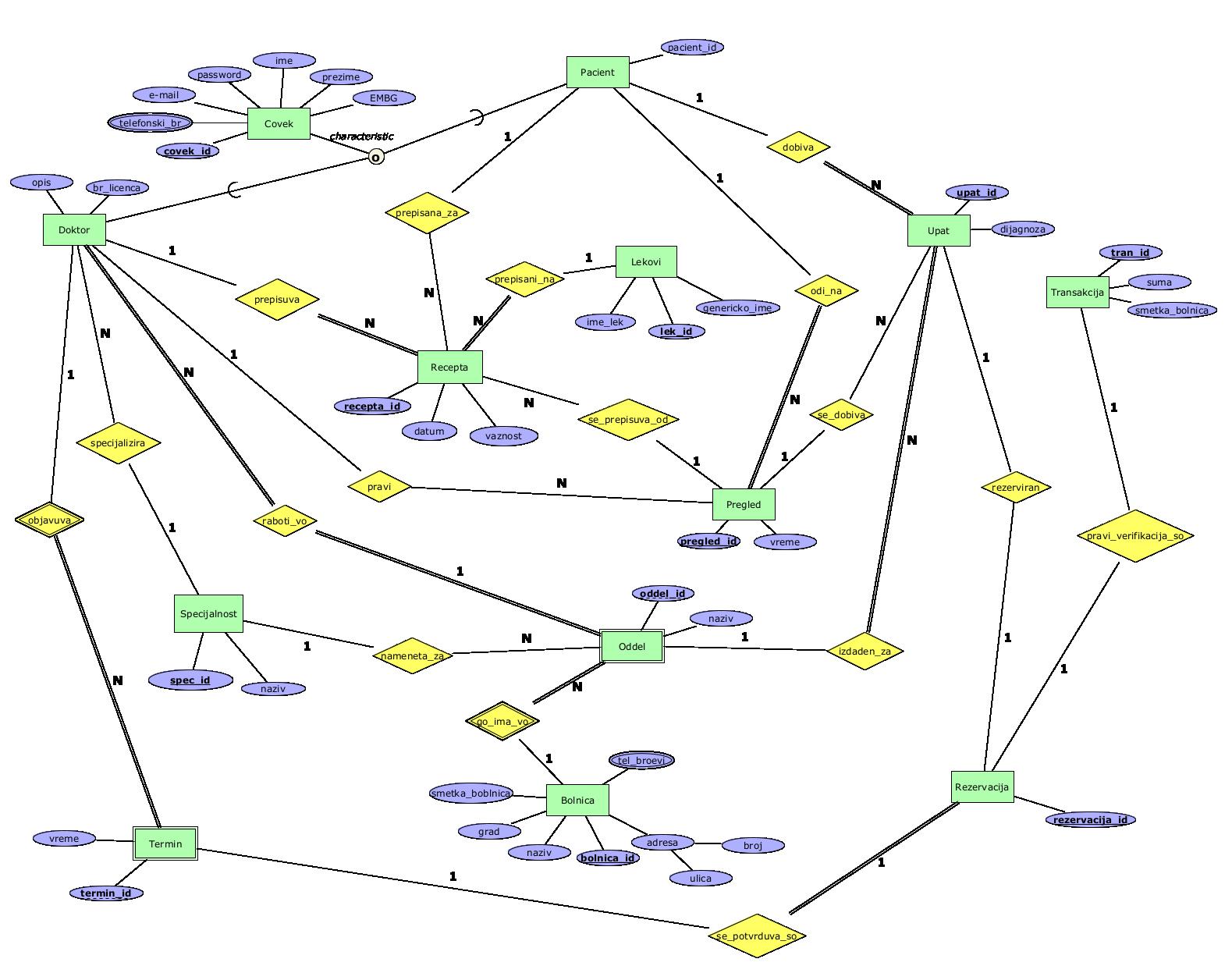 - Oddel - ентитет во кој се чува листа на сите оддели во болниците. Овој е слаб ентитет и е во зависна релација со доктор.