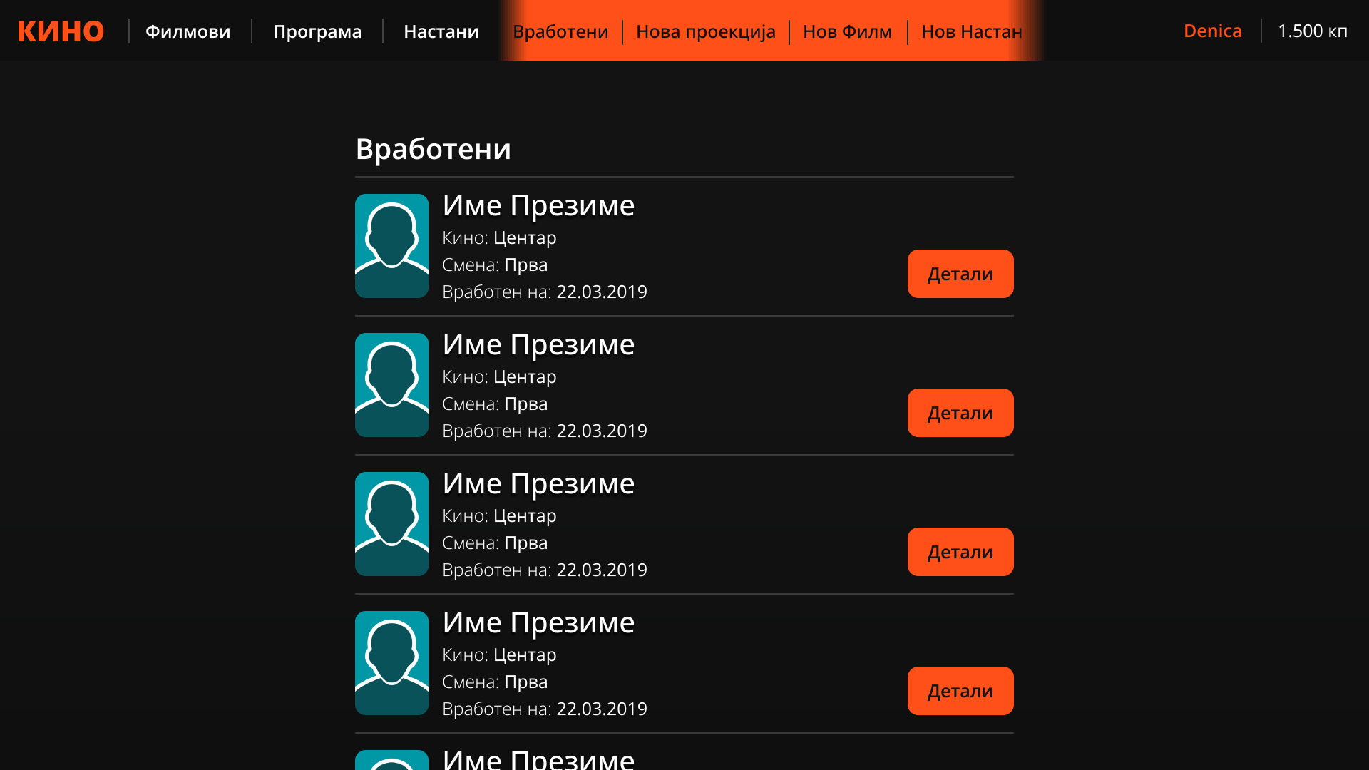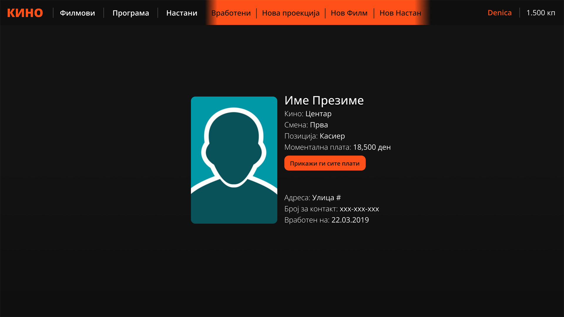 На корисникот му се прикажуваат вработените во конкретното кино.