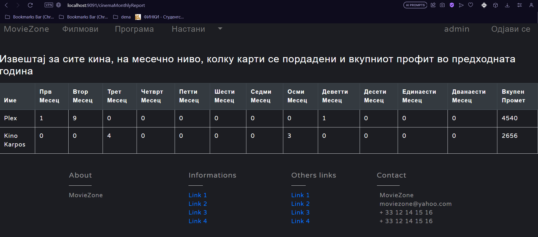 Извештај за сите кина, на месечно ниво, колку карти се пордадени и вкупниот профит во предходната година