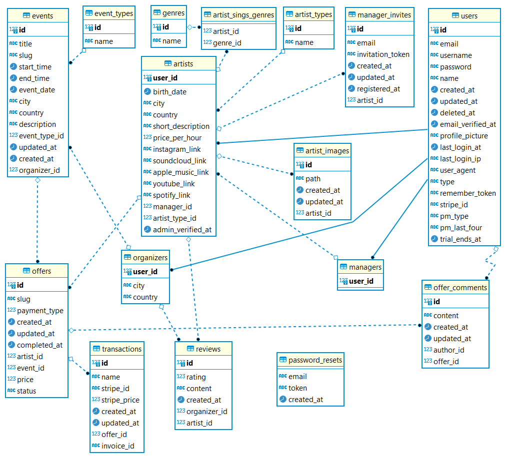 - Artists (user_id*(Users), birth_date, city, country, short_description, price_per_hour, instagram_link, soundcloud_link, apple_music_link, youtube_link, spotify_link, manager_id*(Managers), artist_type_id*(Artist_Types), admin_verified_at)