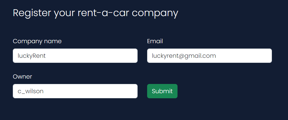 При кликањето на копчето submit се креира нова редица во табелата companies со соодветните пополнети вредности внесени од корисникот, каде што за administrator_id ќе имаме null вредност затоа што уште не е одобрена од страна на администраторот, кога ќе биде одобрена од некој што е администратор, ќе се смени null вредноста со вредноста user_id од администраторот.