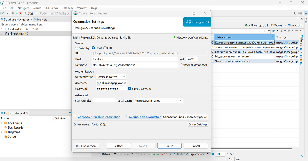 Во табот Main (Database Settings): Host: localhost Database: db_202425z_va_prj_onlineshopsp Username: db_202425z_va_prj_onlineshopsp_owner Password: