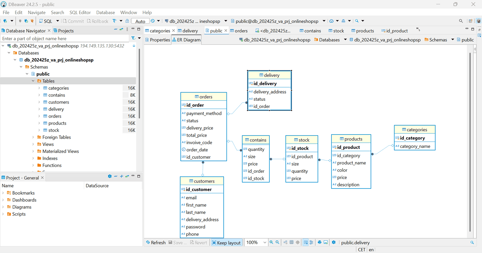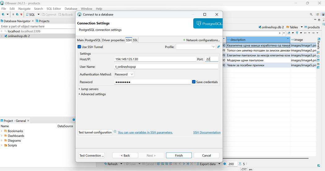 Ако во Visual Studio е поставен портот 22, тогаш треба да се постави тој порт и за SSH тунелот и за поврзувањето со базата во DBeaver. SSH Тунел: Во DBeaver, на табот SSH: SSH Host: 194.149.135.130 SSH Port: 22 SSH Username: t_onlineshopsp SSH Password: Local Port: