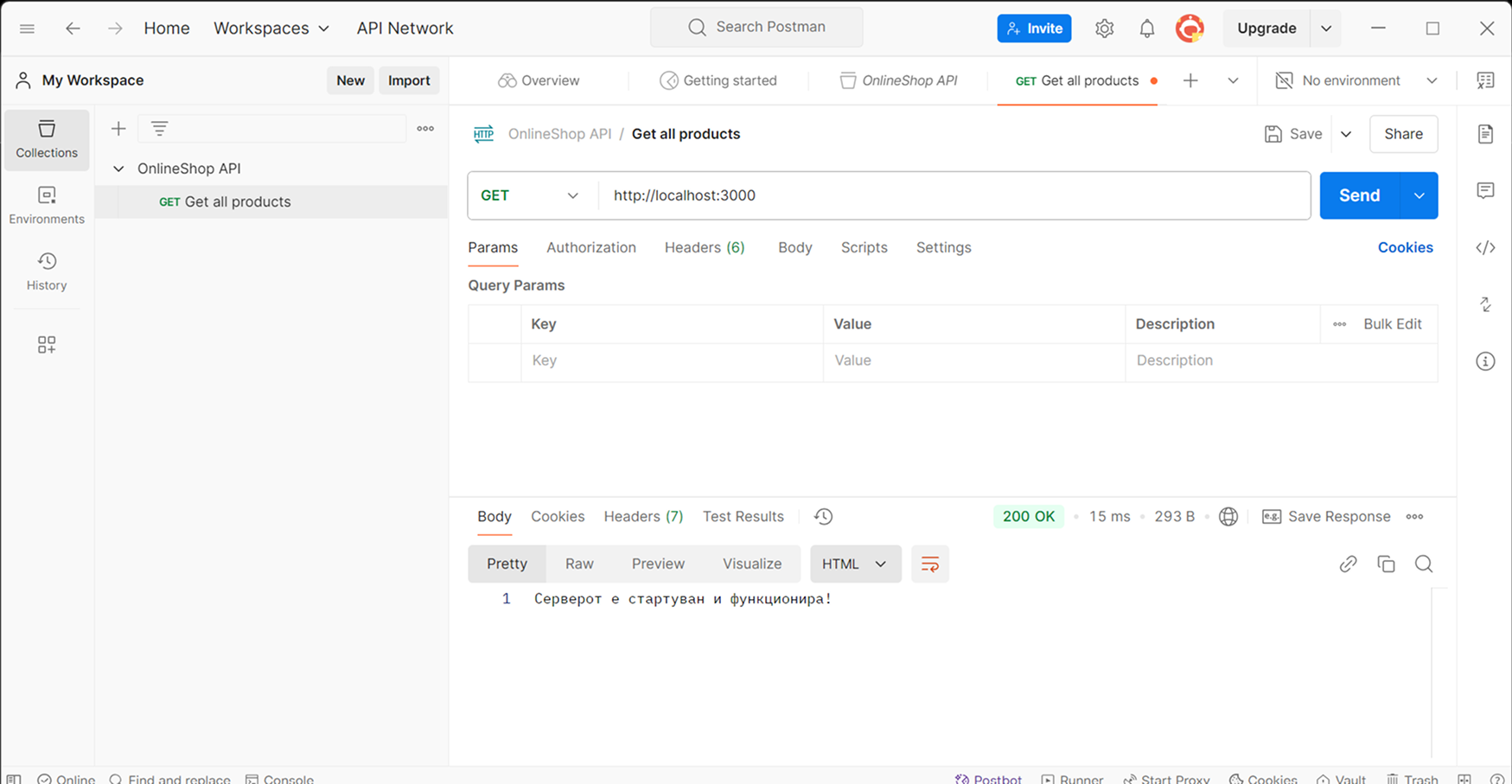 Отварам Postman и во New Tab, и креирав нова колекција со име OnlineShop API. Request ке биде GET метода, и име на барање Get all products. За преземање на сите производи, бираме GET. За креирање на нов корисник, бираме POST.