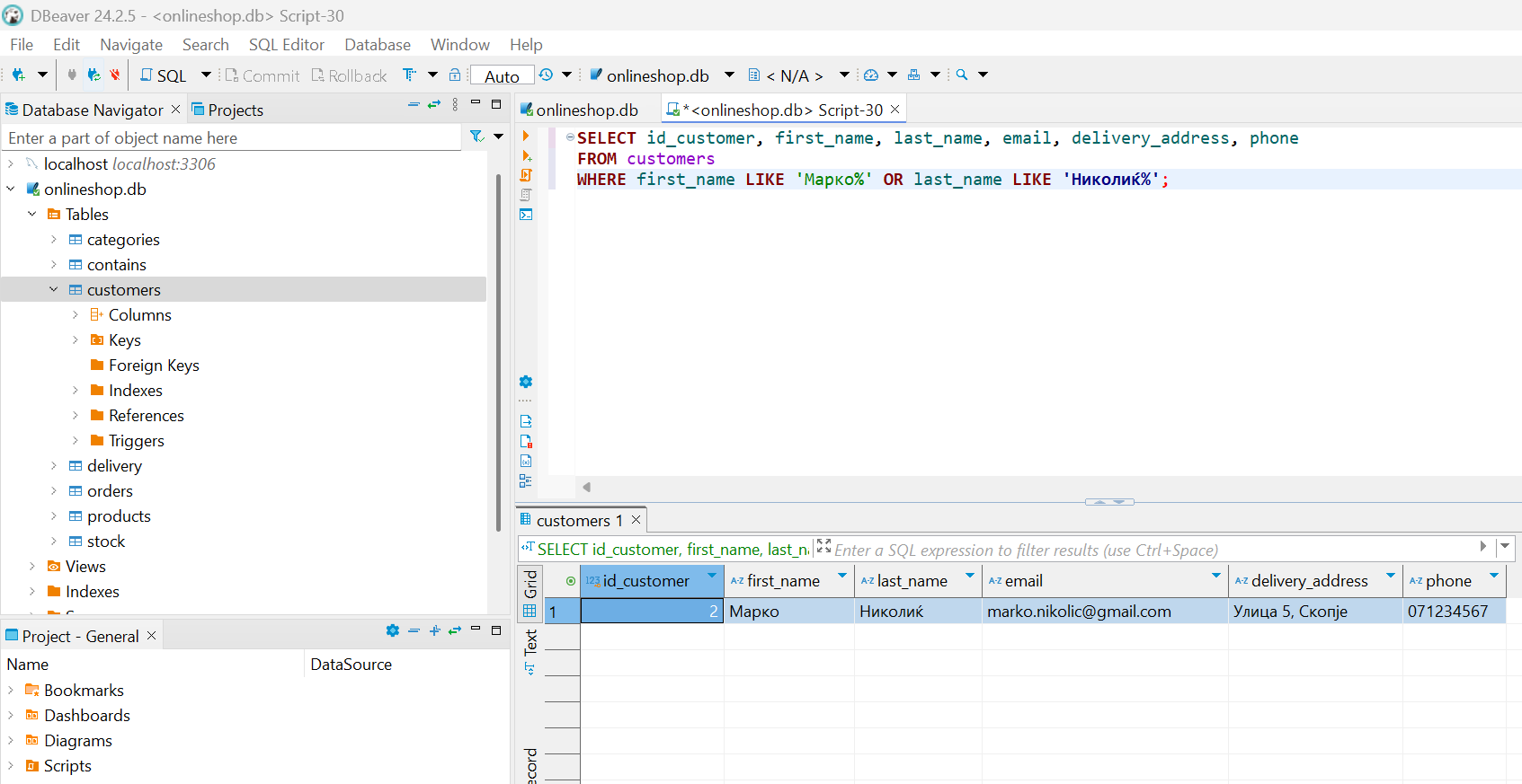 SELECT id_customer, first_name, last_name, email, delivery_address, phone FROM customers WHERE first_name LIKE 'Марко%' OR last_name LIKE 'Николиќ%';