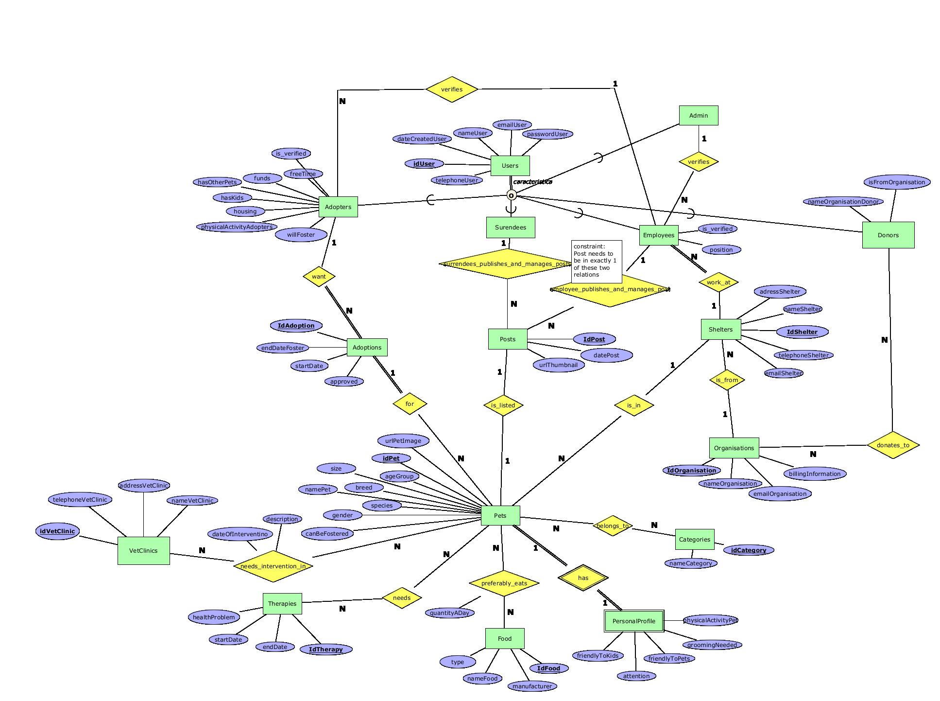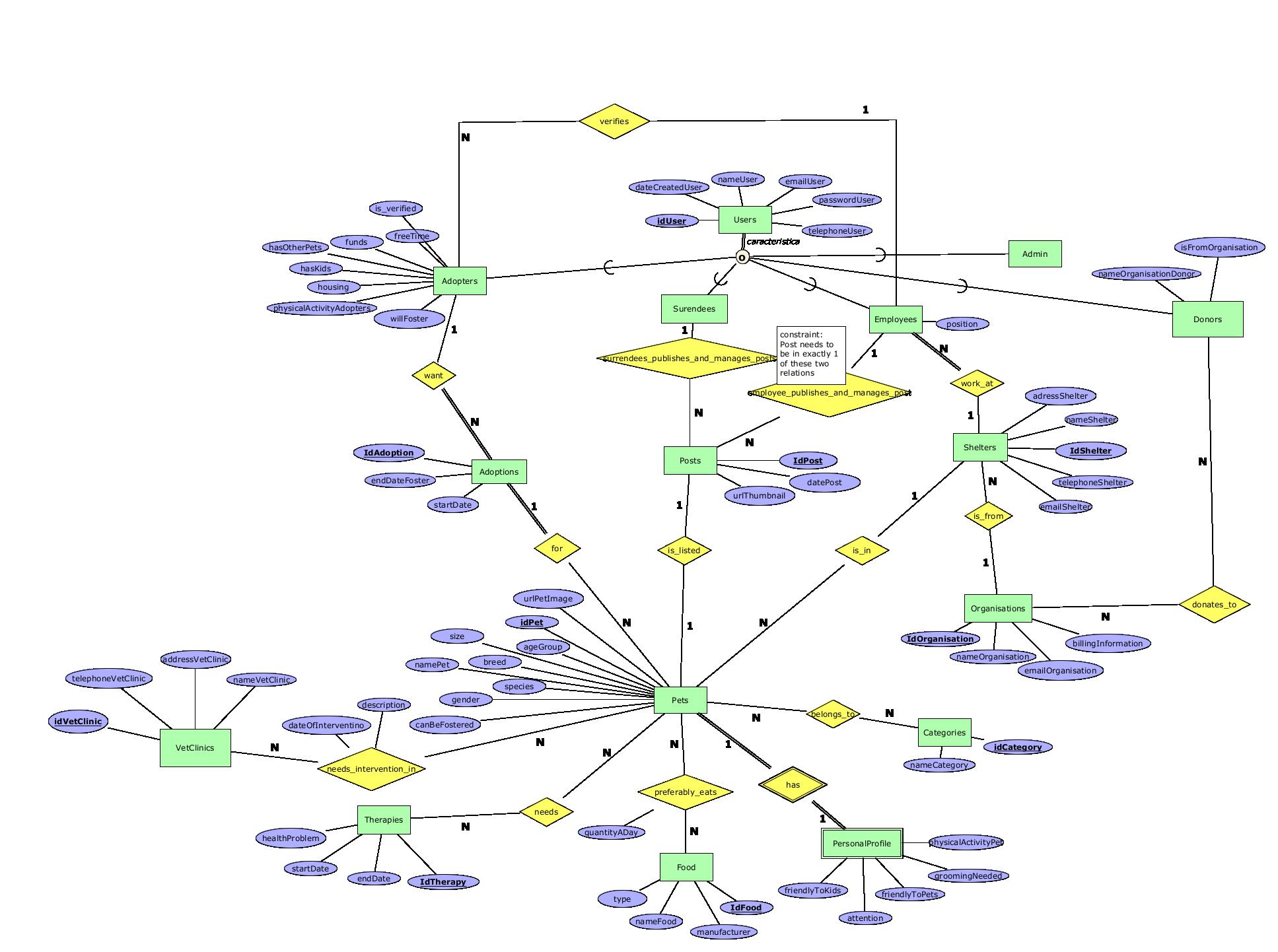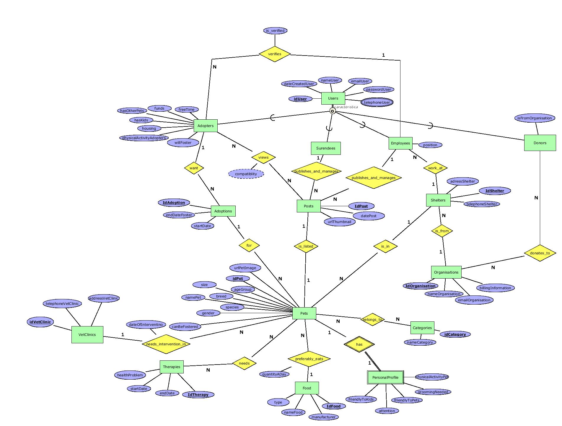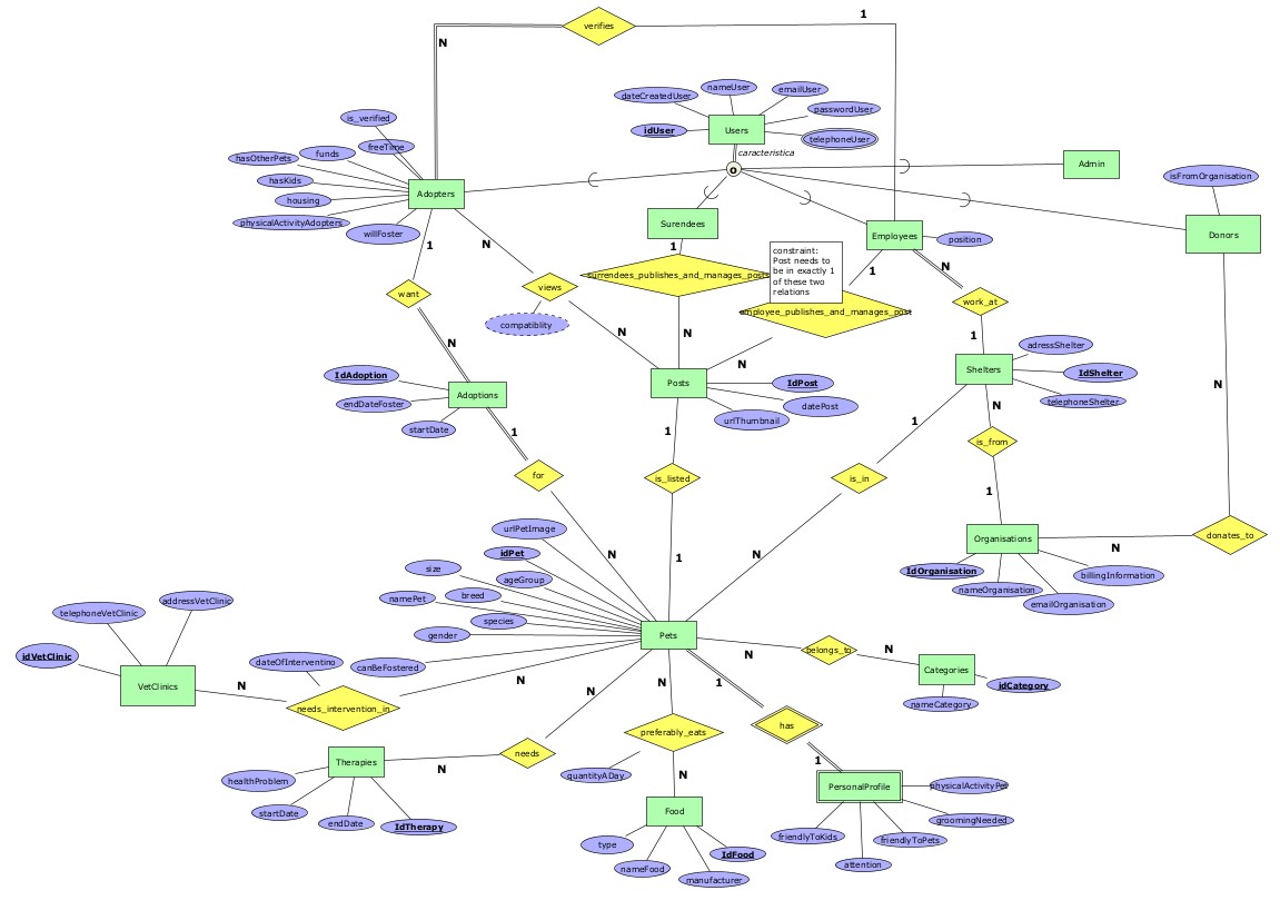 | v.1.3 | 2022.12.14 | Корекции направени при изработка на Ф2: При изработка на табелите се одлучивме атрибутот telephoneUser на User да го промениме да не биде повеќевредностен атрибут. Исто така ја отстранивме врската М-М adopte_views_post бидејќи одлучивме дека не ни е потребна таа табела/релација, чијашто цел беше да го чува пресметаниот атрибут compatibility. Решивме овој атрибут да го пресметуваме во имплементацијата на апликацијата. Го отстранивме тоталното учество од страна на Adopter во релацијата employee_verifies_adopter бидејќи ентитетот смее да постои без да биде во релацијата, а верификацијата е потребна понатаму за во техничката имплементација. Додадовме атрибут nameOrganisationDonor на ентитетот Donor, атрибути nameShelter и emailShelter на ентитетот Shelter, nameVetClinic на VetClinic и атрибут description на М-М релацијата pet_needs_intervention_in_vet_clinic. |