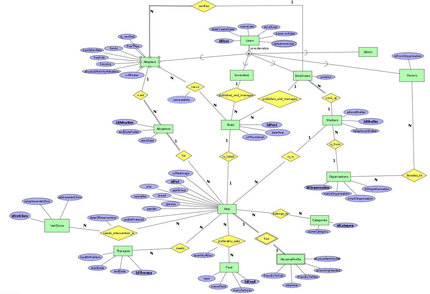 - employee_verifies_adopter - Оваа релација е помеѓу ентитетите Adopters и Employees и служи за да ги поврзе двата типа на корисници за да може секој од корисниците кои сакаат да посвојат да бидат верифицирани од страна на обучен вработен дека е соодветен за да посвои милениче. Еден Adopter е верификуван од еден Employee. Еден Employee може да верификува повеќе Adopters. Целта на оваа релација е да служи за проверка дали некој Adopter е валиден и смее да посвои.
