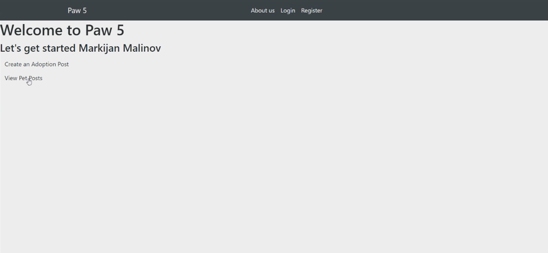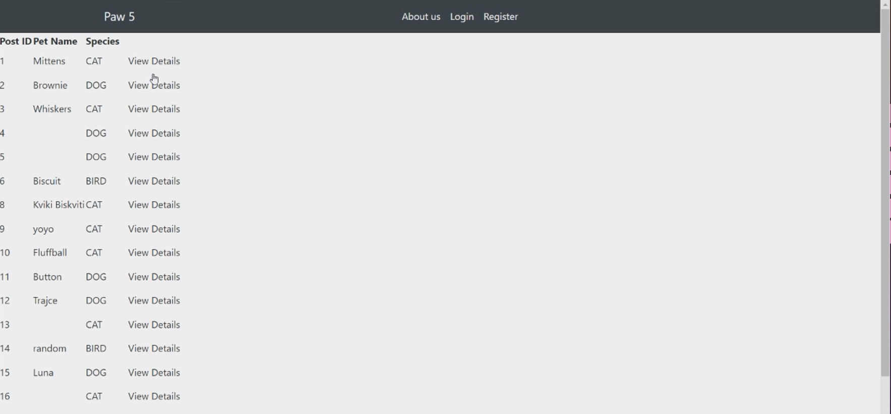 На корисникот му се прикажува листа со огласи и основни информации за миленичињата. Корисникот може да погледне детали со клик на копчето View Details.