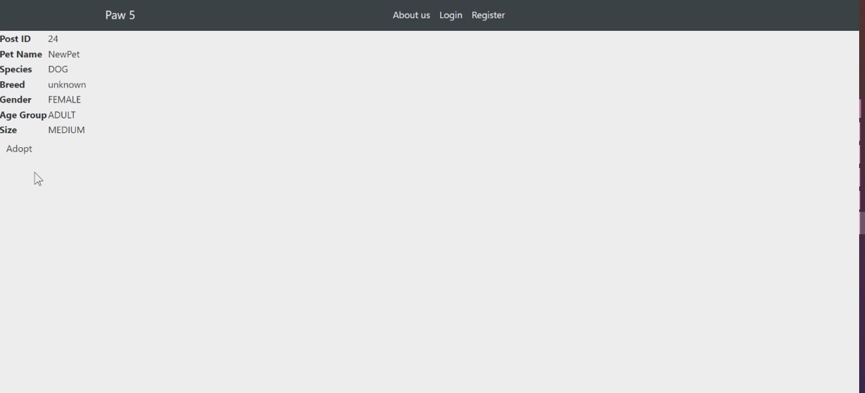 На оваа страна се прикажани повеќе информации за избраното милениче. Корисникот може да кликне на копчето Adopt за да го посвои миленичето.