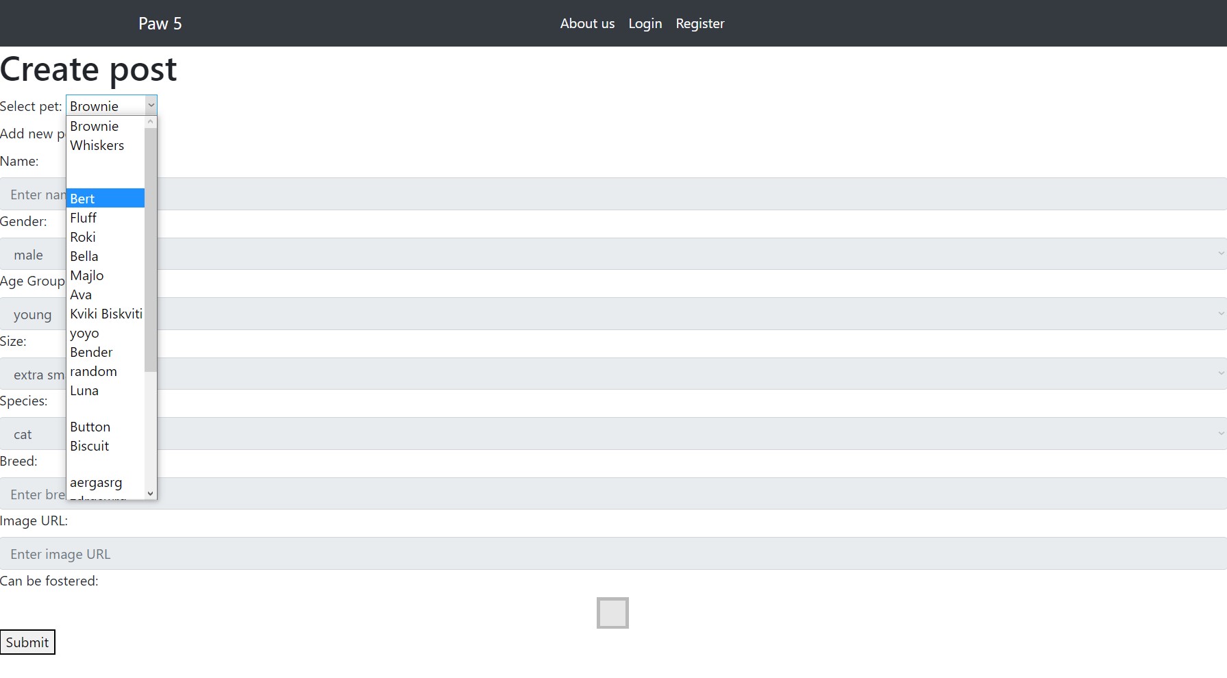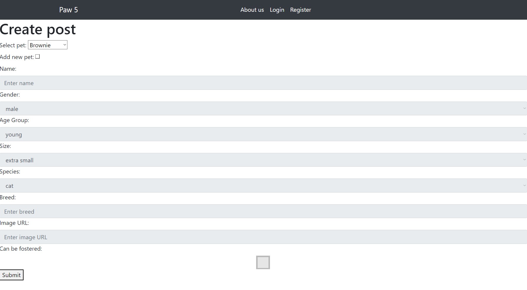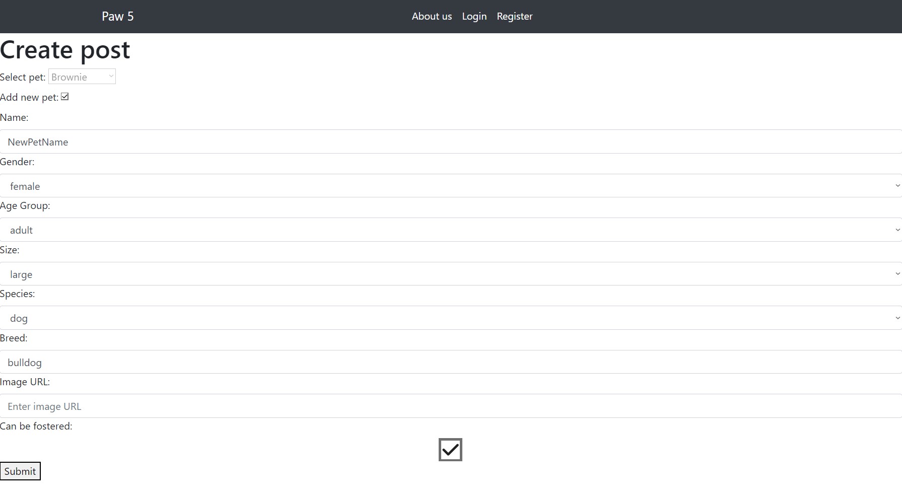 Доколку пак сака да креира оглас за ново милениче кое веќе не е додадено во базата прво ја штиклира опцијата add new pet со што се овозможува да ги пополни полињата со податоци за миленичето. На крајот клика на копчето Submit.