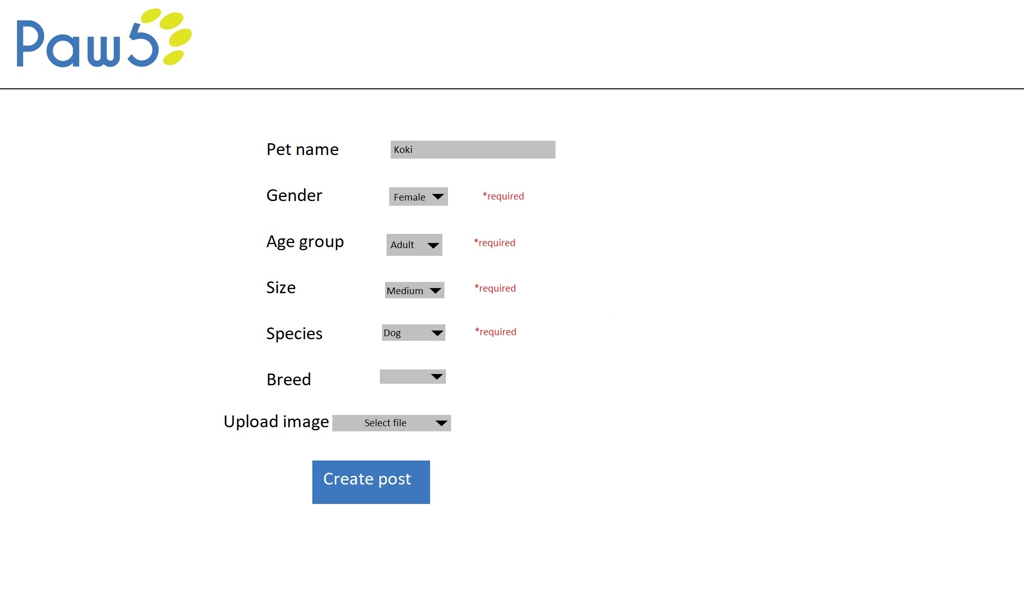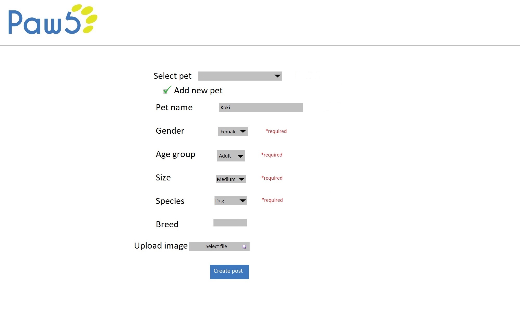 Корисникот ја избира опцијата за креирање на оглас на милениче за посвојување.