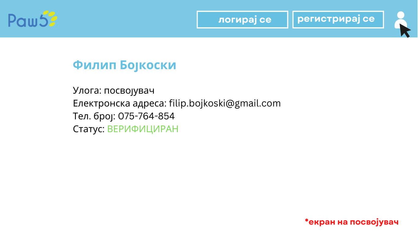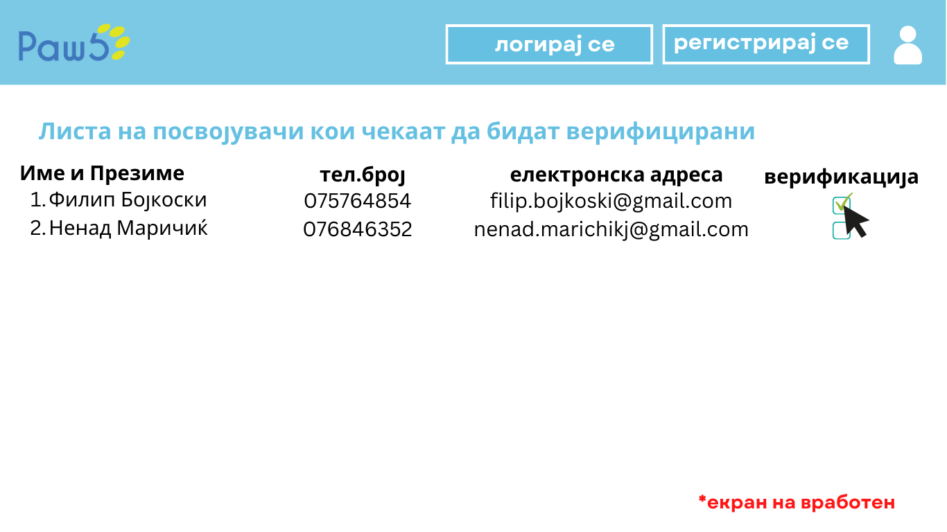 - Посвојувачот чека да биде одобрен од вработен во прифатилиште, додека вработениот во прифатилиштеја гледа листата со сите нови корисници посвојувачи кои чекаат да бидат верифицирани