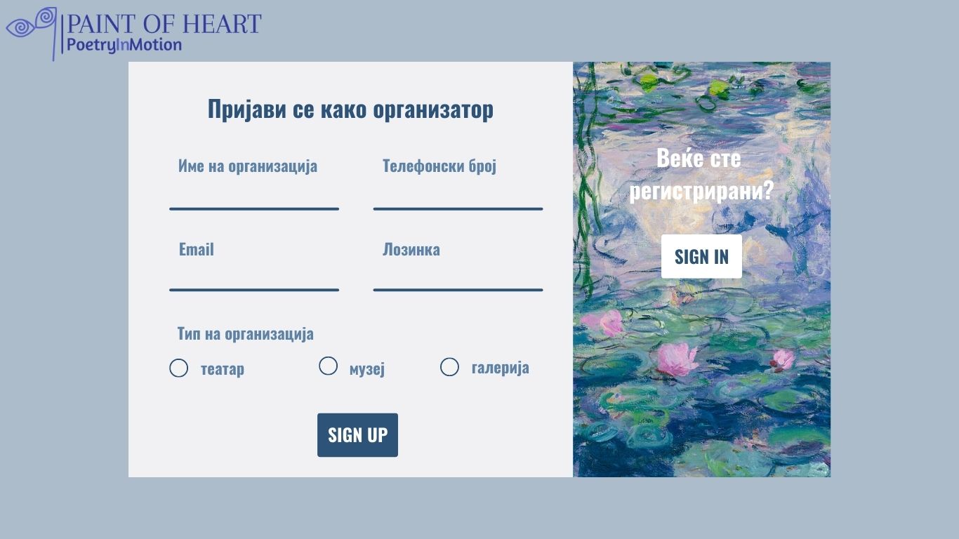 На корисникот му се прикажува почетната страна и кликнува на 'Организирај' делот од навигацискиот бар.