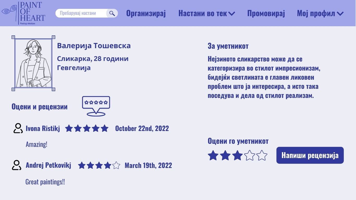 Со кликнување на името на артистот, купувачот го разгледува неговиот профил и клика на копчето 'Напиши рецензија'.