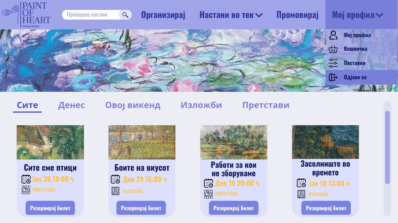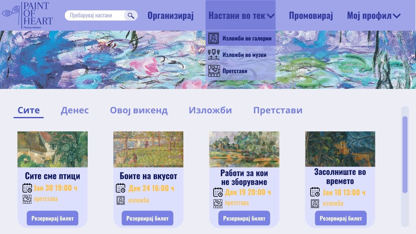 Следува приказ на листа од активни настани од областа на уметност и search поле за пребарување.