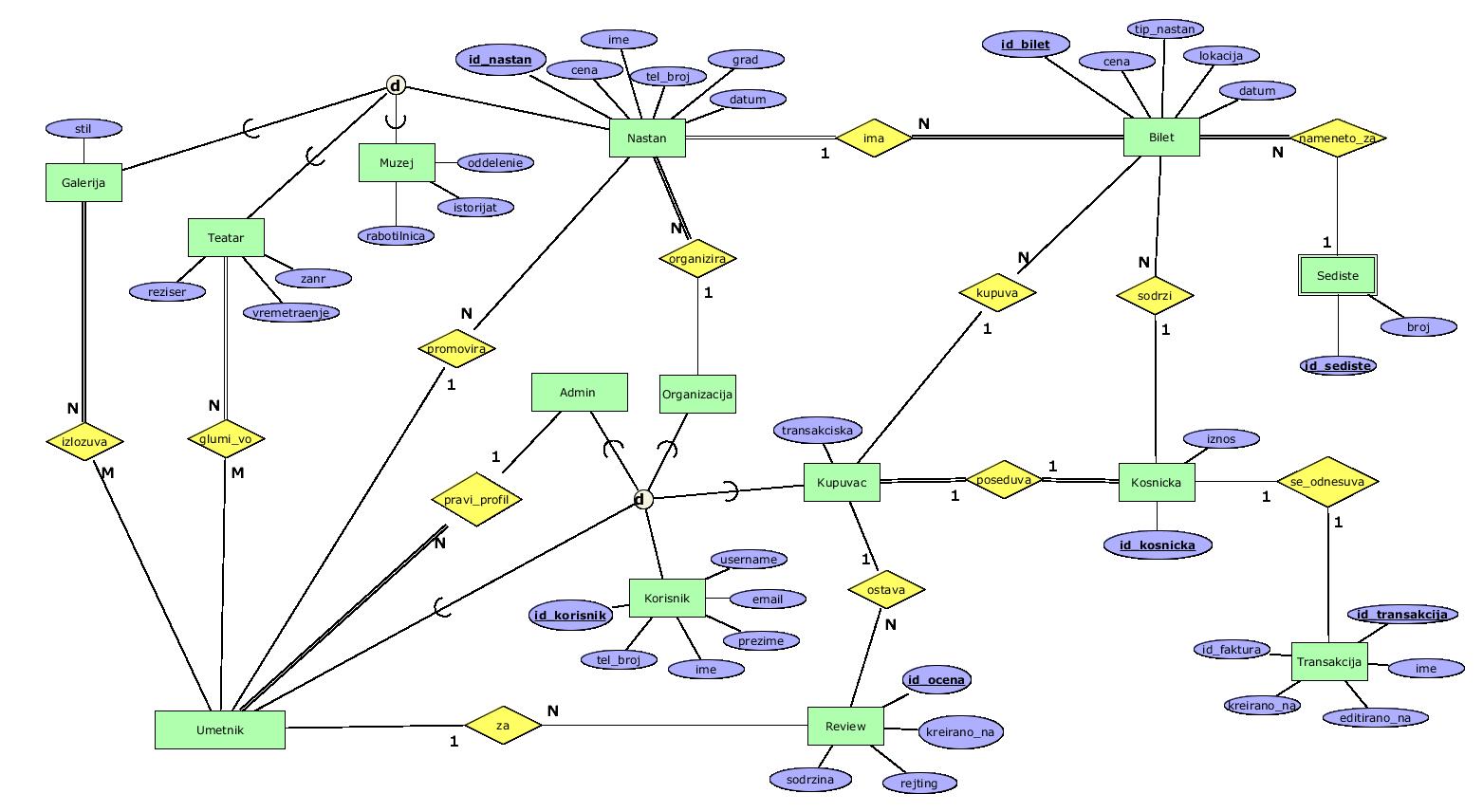 - has_ticket - 1:N релација, со тотално учество од двете страни, помеѓу Event и Ticket која го означува билетот кој што се однесува на даден настан