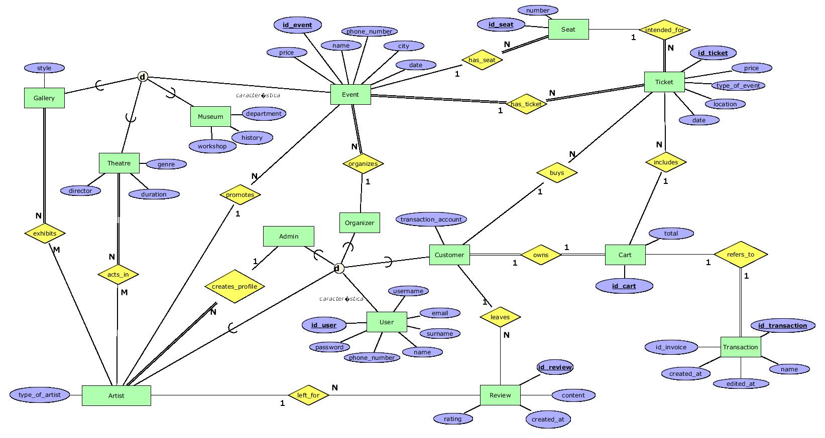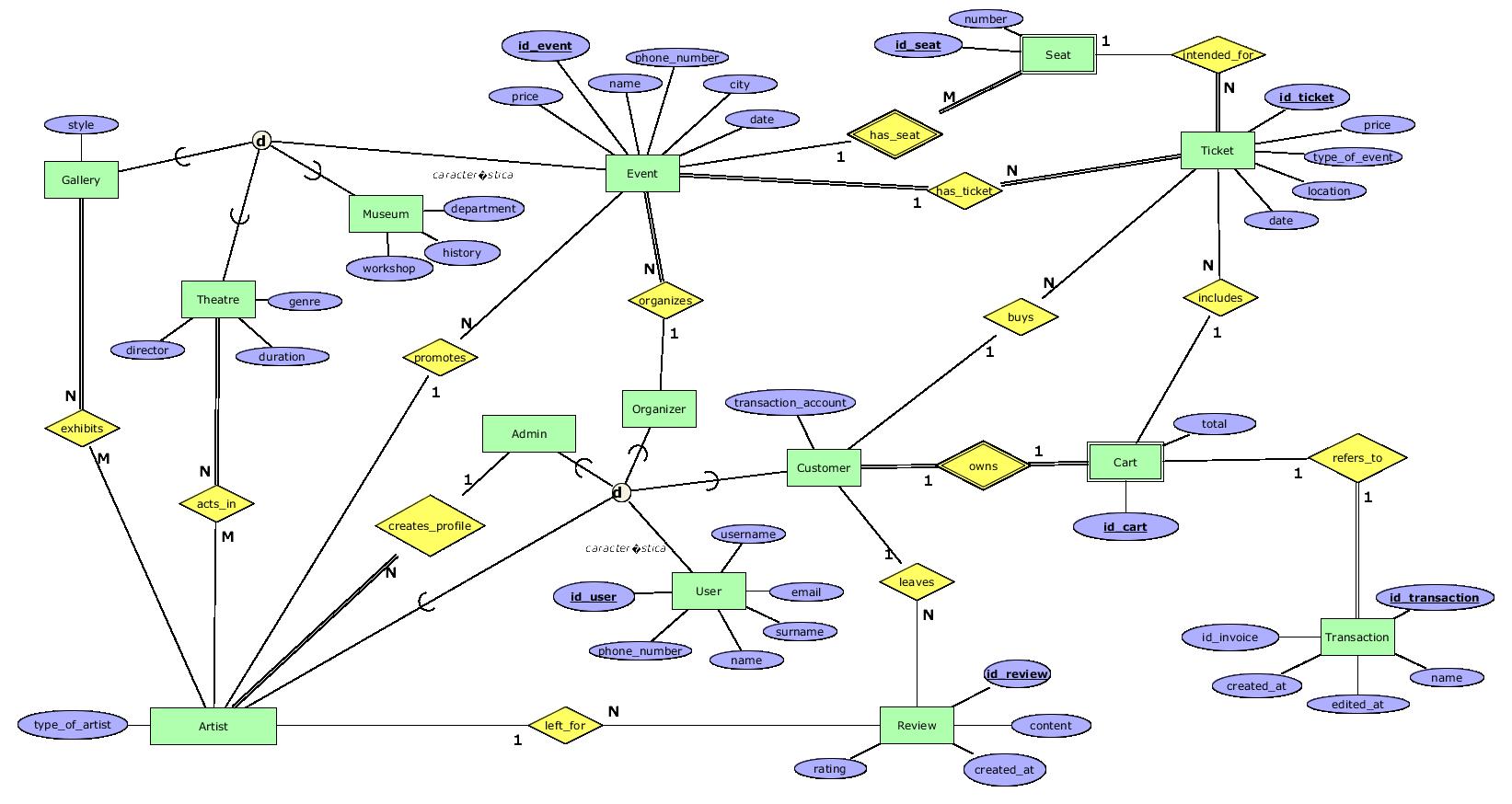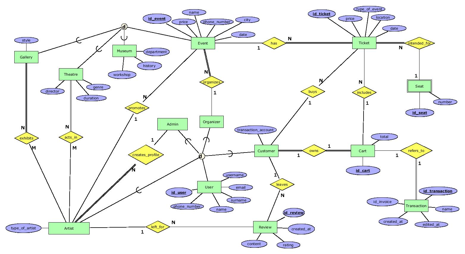 - leaves - 1:N релација помеѓу Customer и Review со која купувачот може да ги оценува настаните кои ги посетил