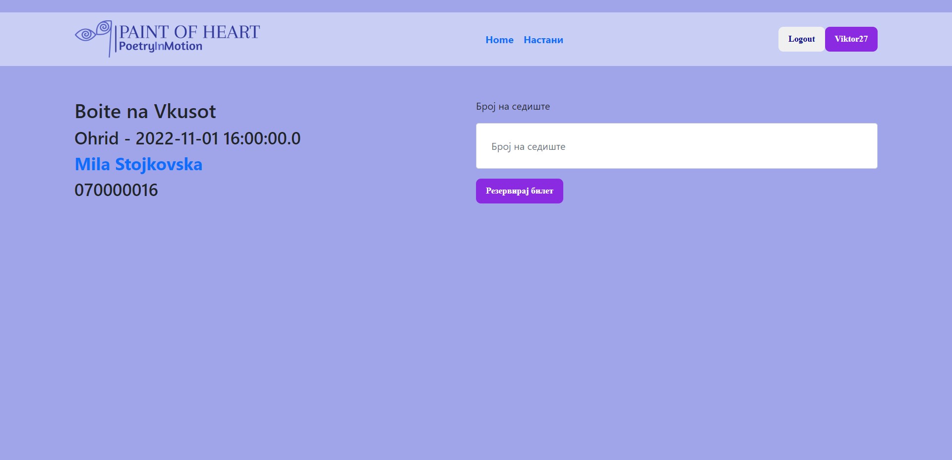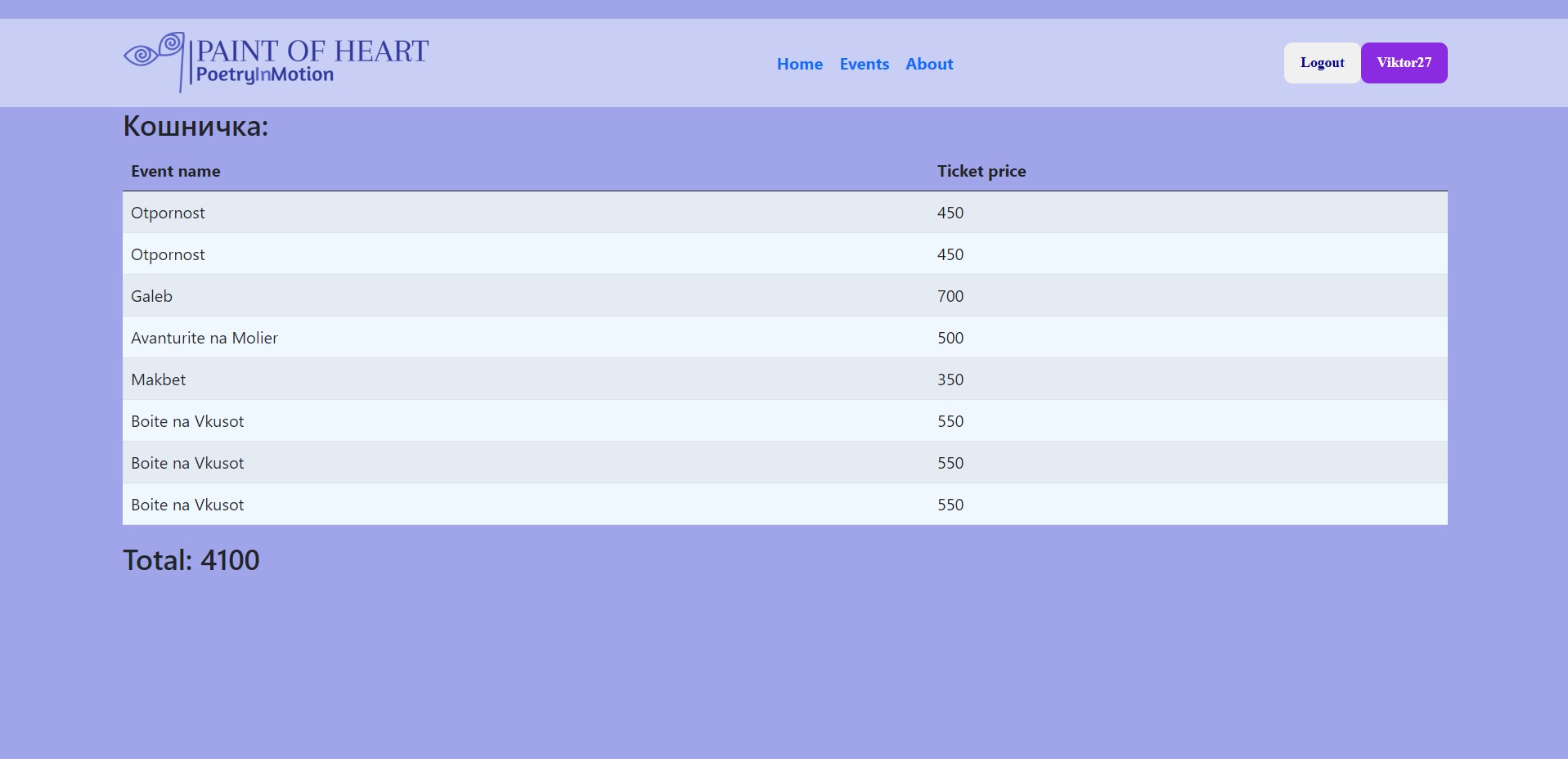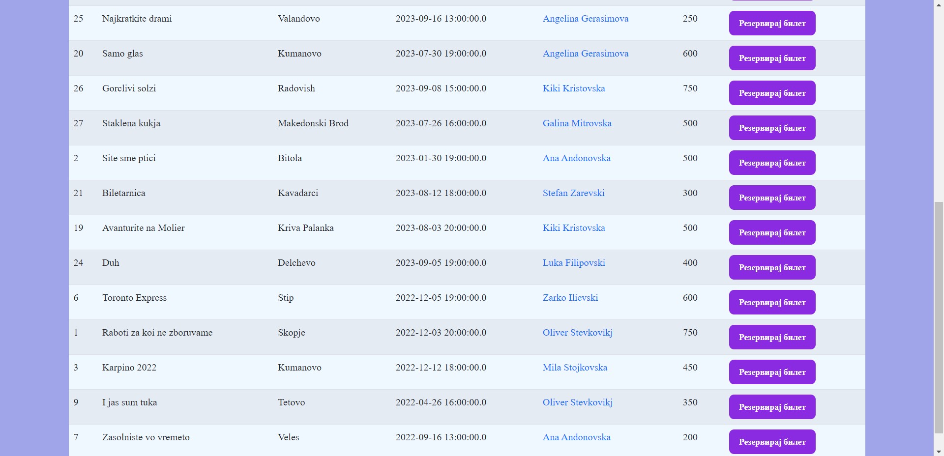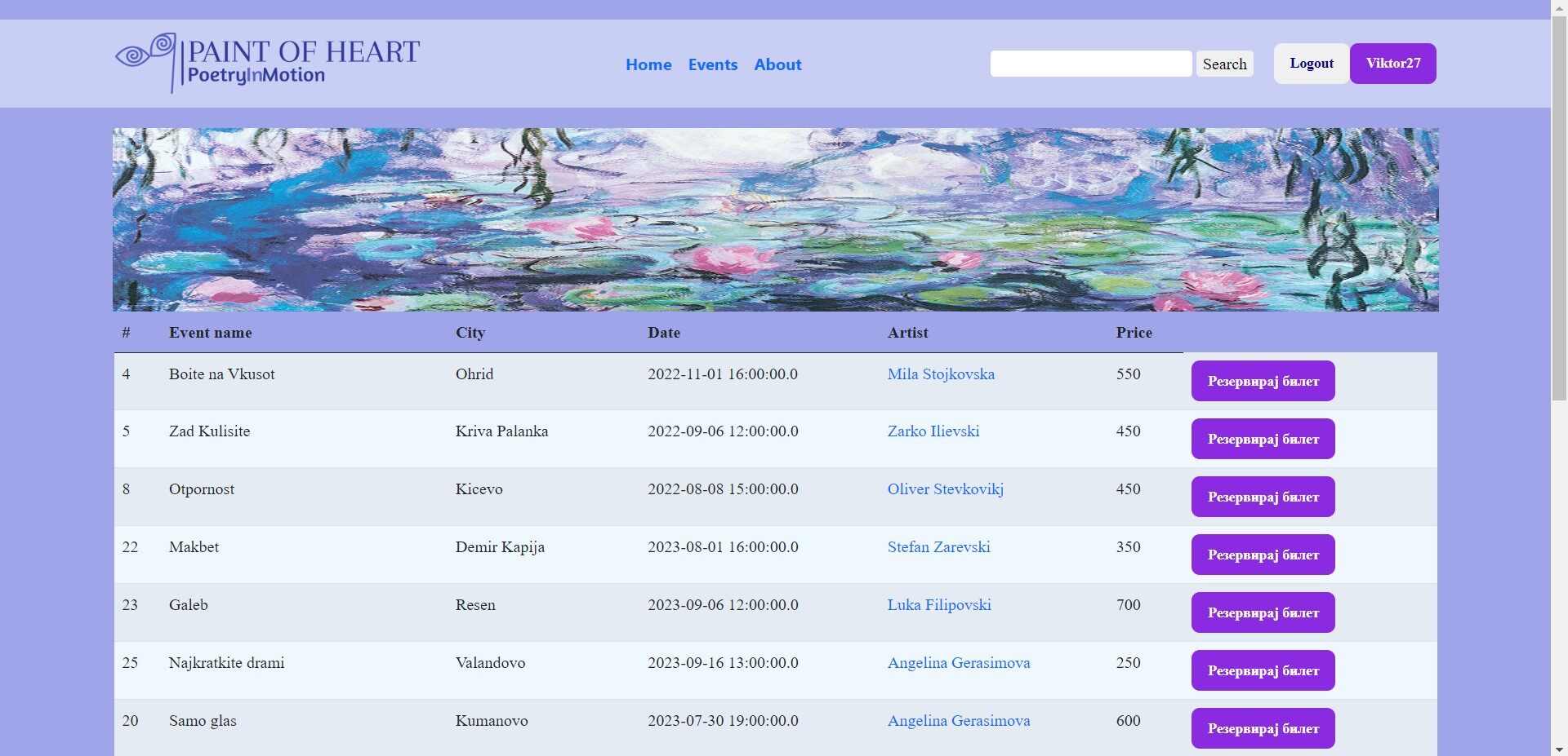 - Следна страница од навигациското мени, кон која корисникот, без разлика на кој модул на корисник припаѓа, може да навигира е Events страницата. Со избирање на ова страница, на корисникот му се прикажува нова страница, со излистани актуелни културни настани од областа (театар, музеј, галерија) со потребни информации: име на настан, град, датум на одржување на самиот настан, артист кој учсетвува во настанот и на крај цената на билетот, кој е потребен за влез на настанот. Тука за сега не е достапна опцијата на резервирање на настан, како и купување на билетот. За таа цел потребно е корисникот да е регистриран на системот, а подоцна и најавен.