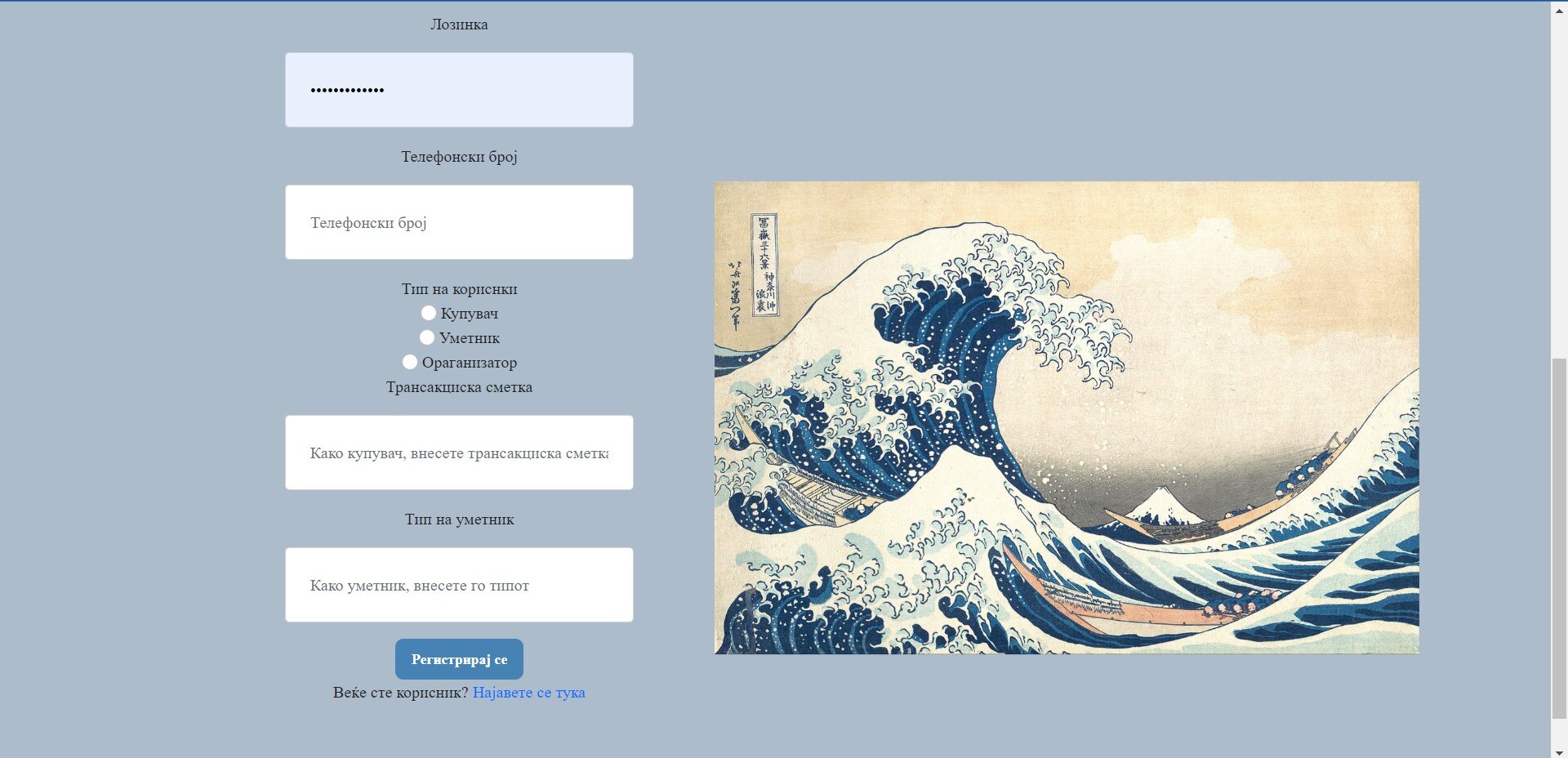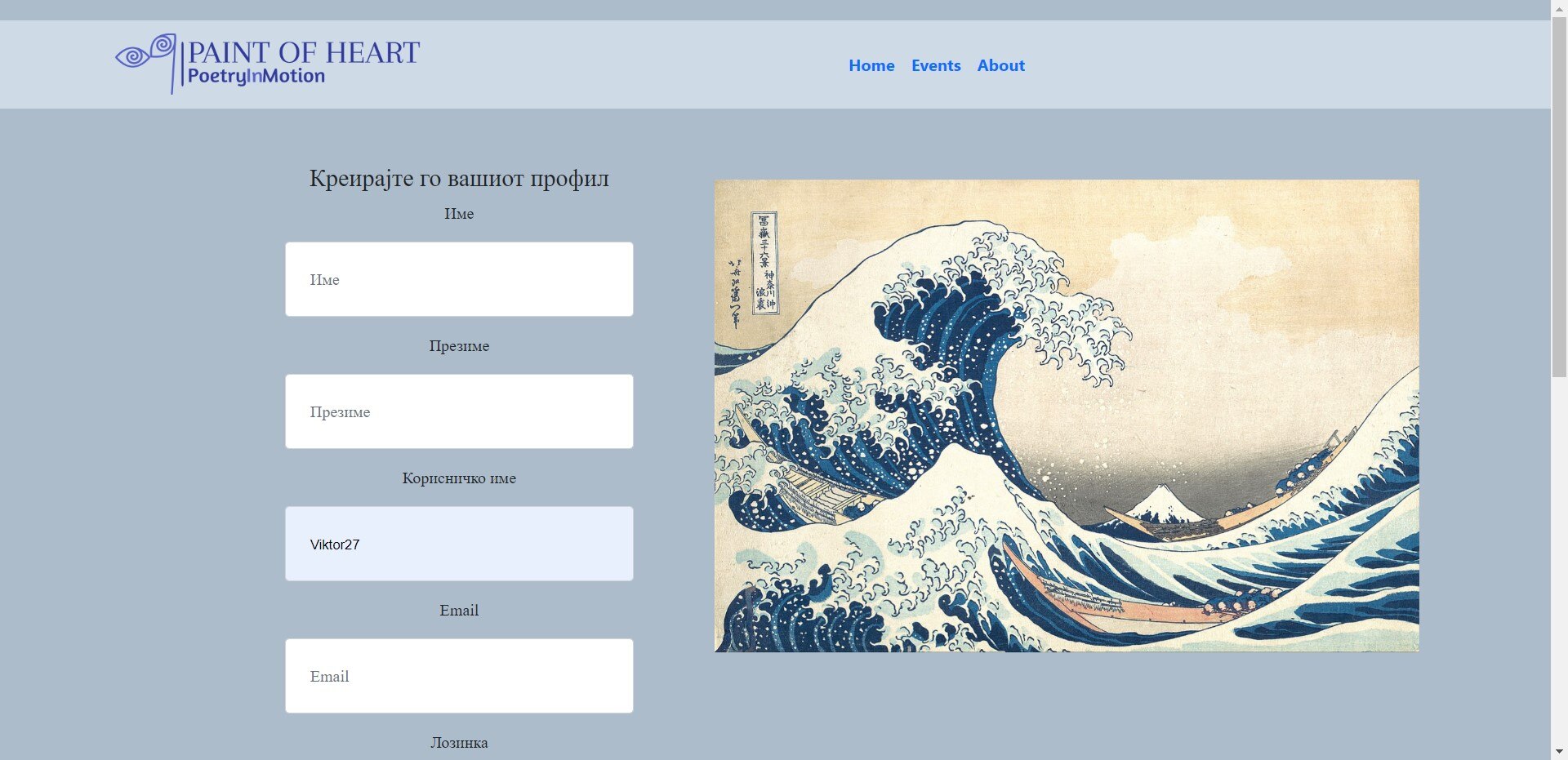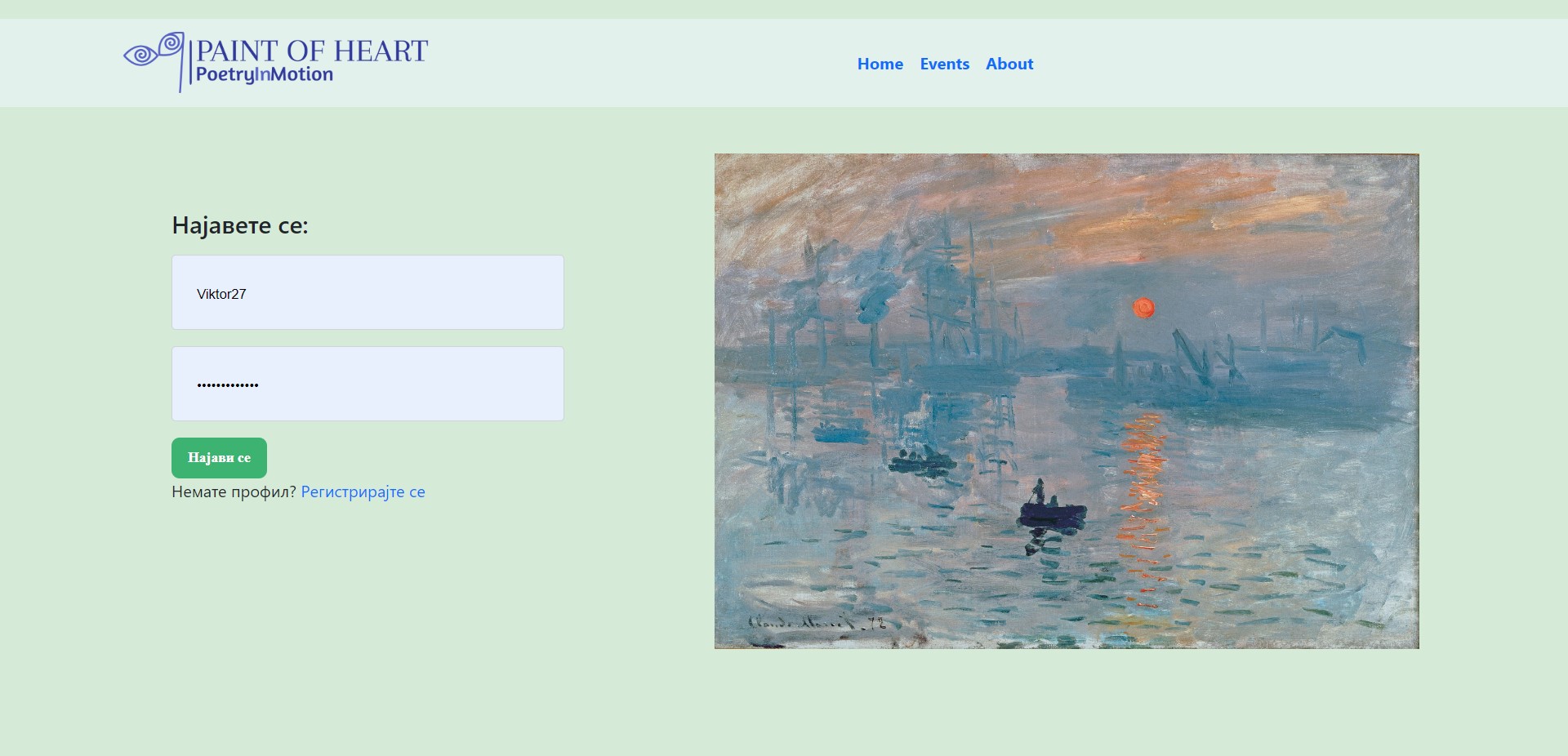 - Кога ќе пристапите до http://localhost:9080/home во пребарувачот, на вашиот уред ќе се прикаже почетната страница на апликацијата. Тука е прикажана само илустрација, концизна информација која е намената на апликацијата, навигациското мени, во кое се наоѓаат HOME, Events и About копчето. Како и копчињата за регистрација и најава на корисникот.