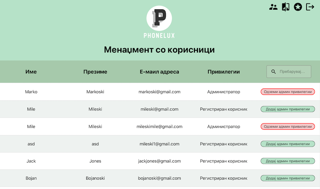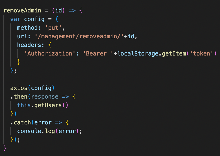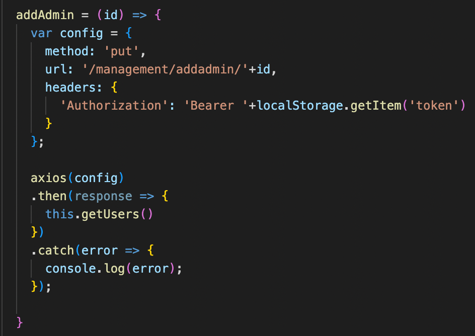 За доделување на пермисии за администратор на даден корисник, супер администраторот тоа го прави со клик на копчињата "Додај админ привилегии" и "Одземи админ привилегии", на кои што при самиот клик се повикуваат функциите "addAdmin" или "removeAdmin", во зависност од тоа кое копче е притиснато. Двете функции испраќаат PUT request до бекенд апликацијата.