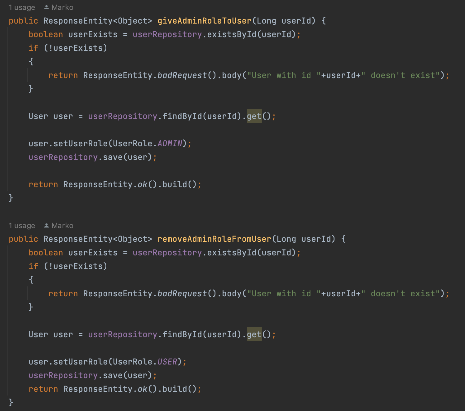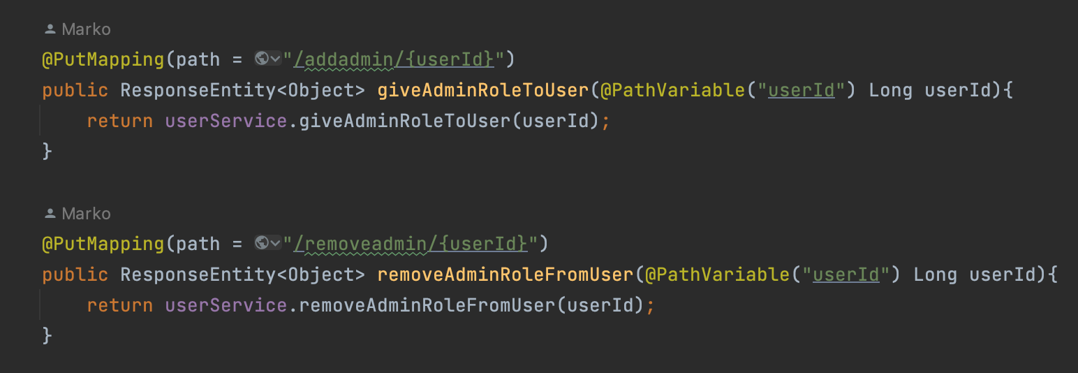 Во зависност од тоа кое барање е пристигнато, се повикува методот за доделување или одземање на админ привилегиите на корисникот. Во методите, се проверува дали корисникот го има во датабаза, и доколку го има се одзема или доделува привилегии за администратор, а потоа повторно се зачувува во датабаза.