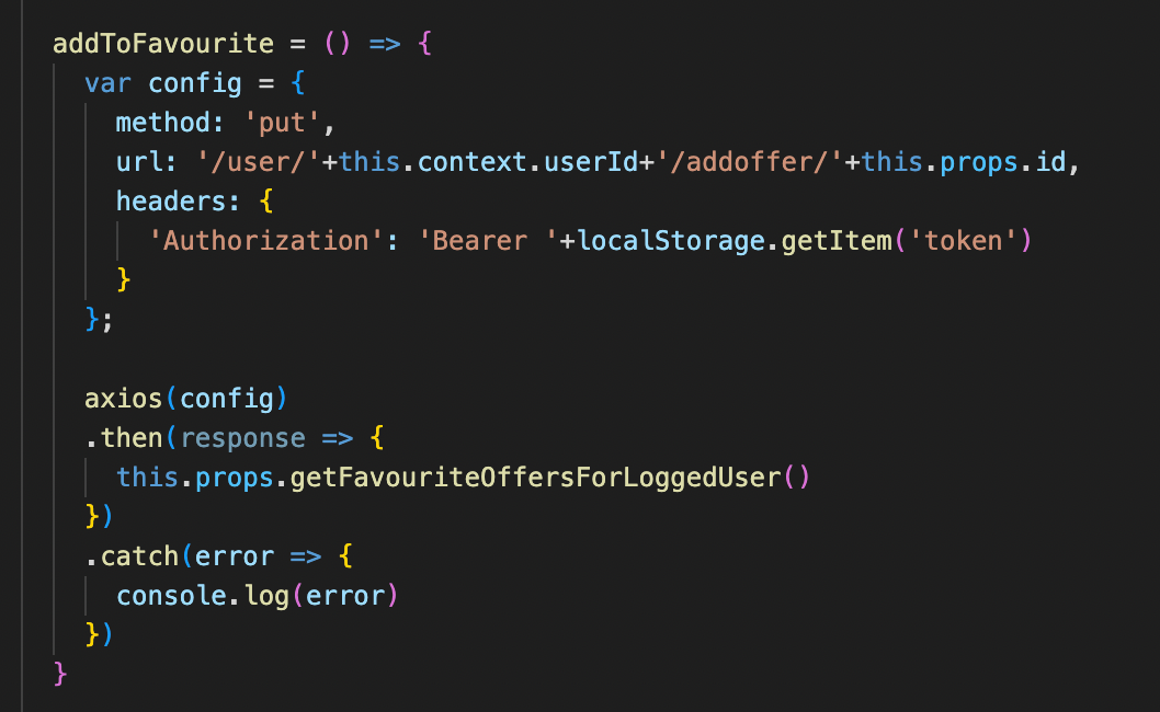 За додавање на понуда како омилена, корисникот тоа го прави со клик на ѕвезда иконата на која што при самиот клик се повикува функција која што испраќа PUT request до бекенд апликацијата.