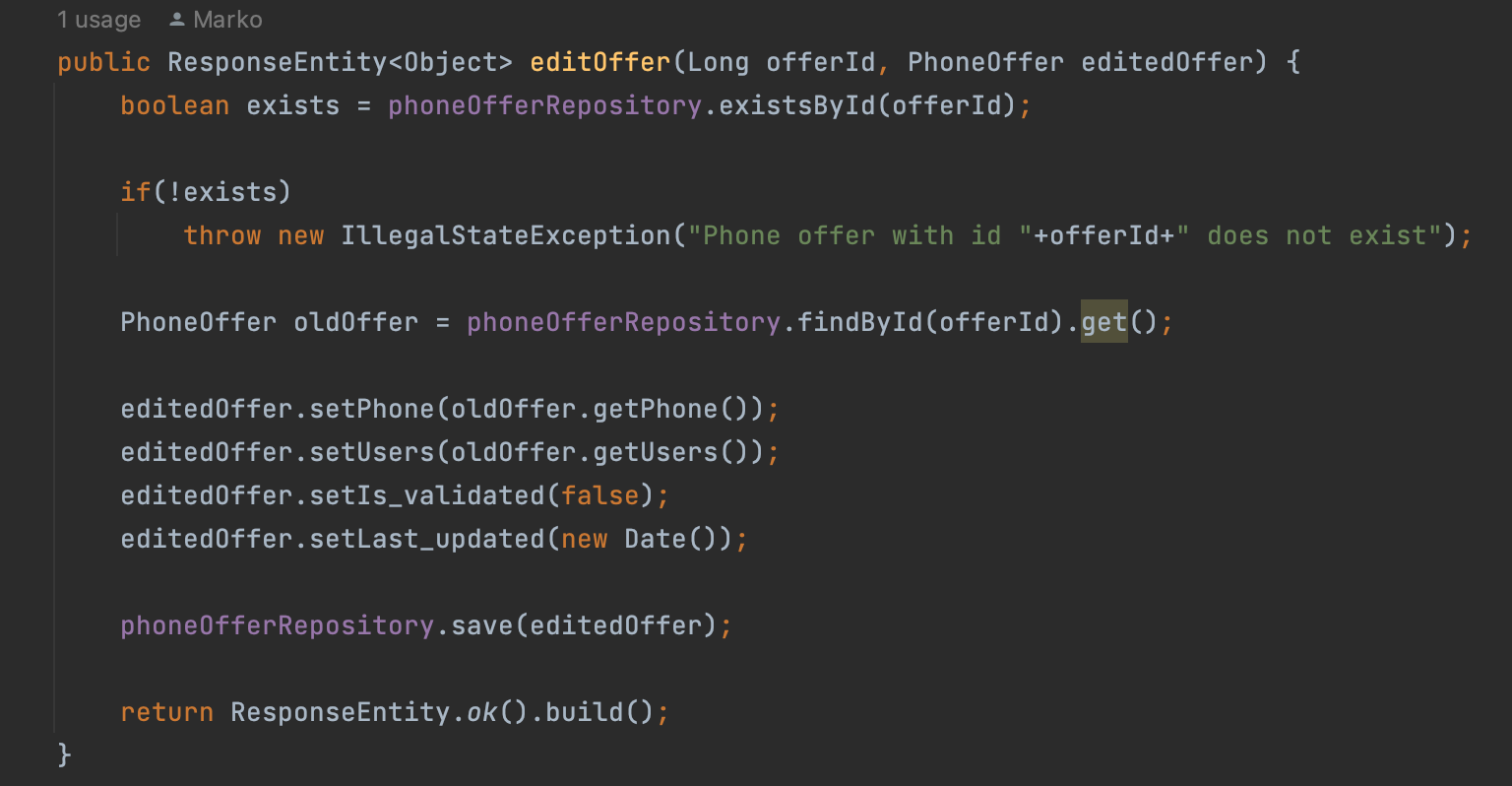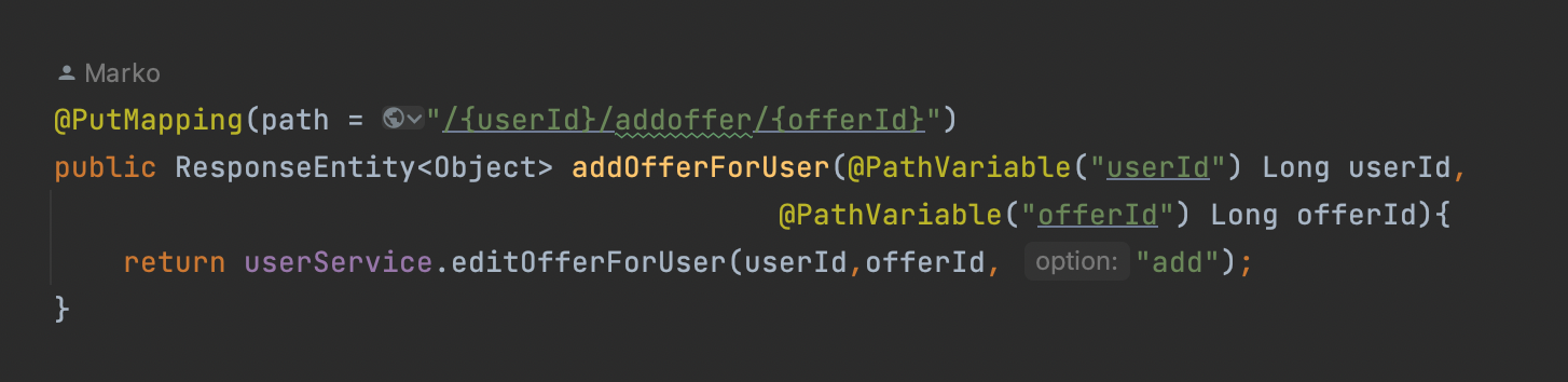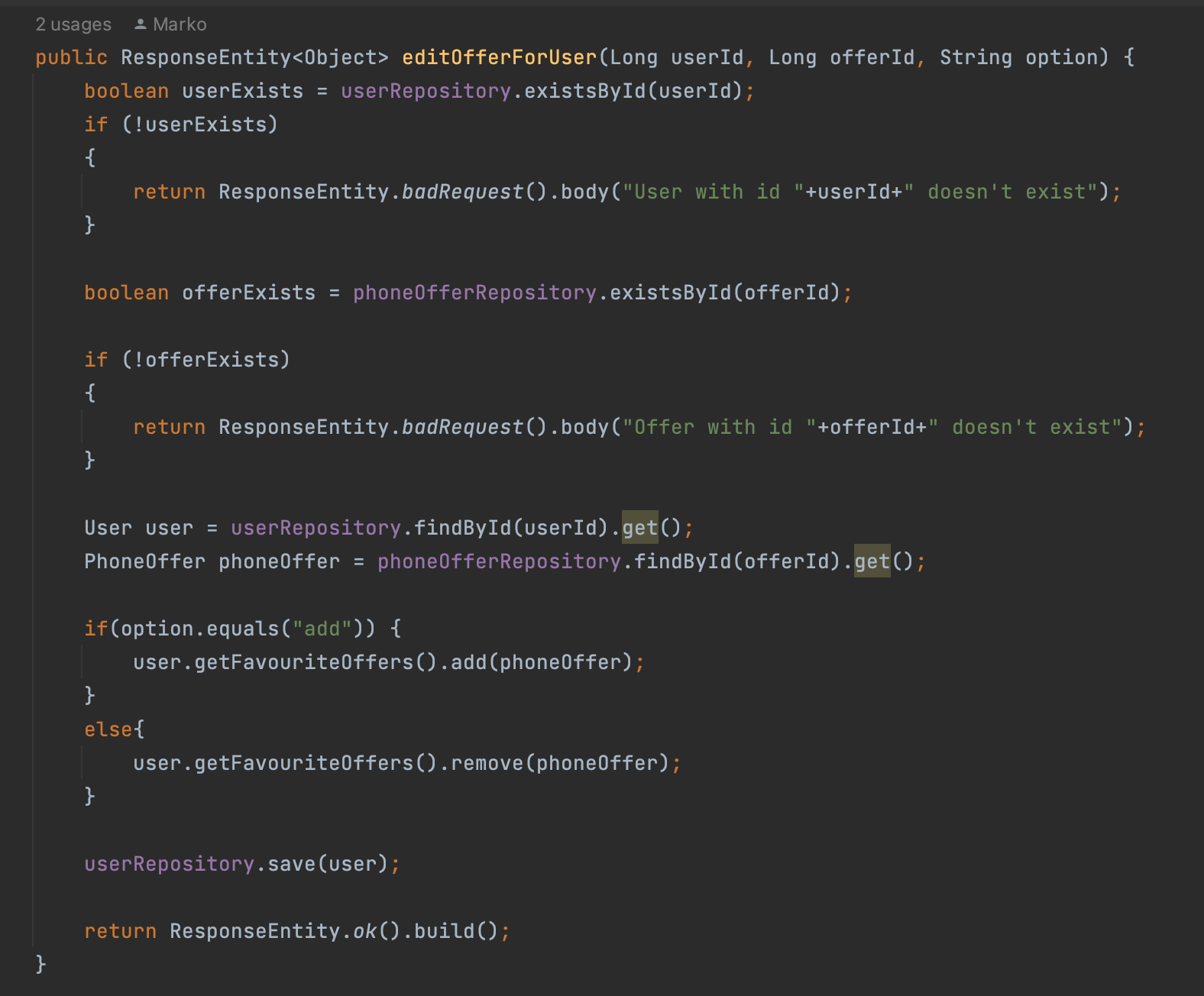 Методот кој што се повикува од сервисот, се користи и за додавање и за бришење на омилени понуди, во зависност од проследениот параметар "option". При додавање, се проследува "add", при бришење "remove". Првично, се прави проверка дали понудата и корисникот постојат во датабазата. Доколку не постојат, ќе се врати статус 400 (bad request). Во спротивно, се зема корисникот и понудата од датабаза, понудата се додава на корисникот и потоа се зачувува повторно корисникот во датабаза.