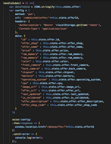За промена на спецификациите на дадена понуда, администраторот тоа го прави со клик на копчето "Измени", каде што при самиот клик се повикува функција која што испраќа PUT request, со објект кој што ги содржи нововнесените спецификации до бекенд апликацијата.
