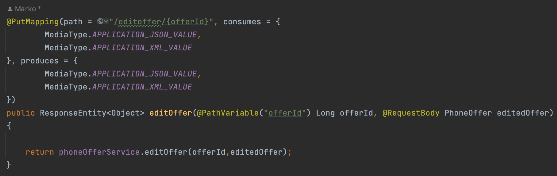Во методот кој што се повикува од сервисот, се додаваат уште неколку потребни атрибути кои што треба да ги содржи понудата, а потоа се зачувува истата со нововнесените спецификации.