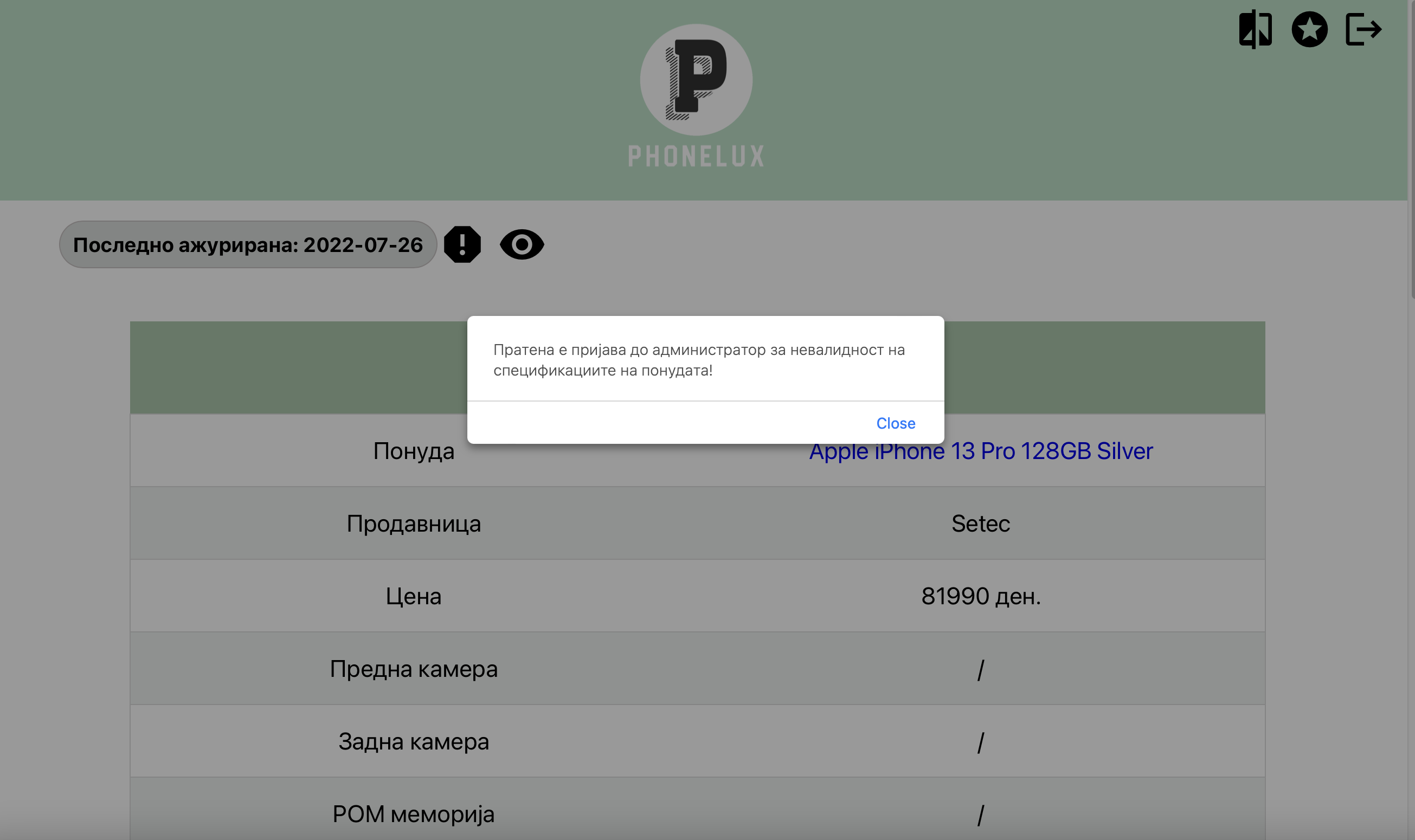 | 1 | Прави измена на спецификациите на понуда за даден мобилен телефон |