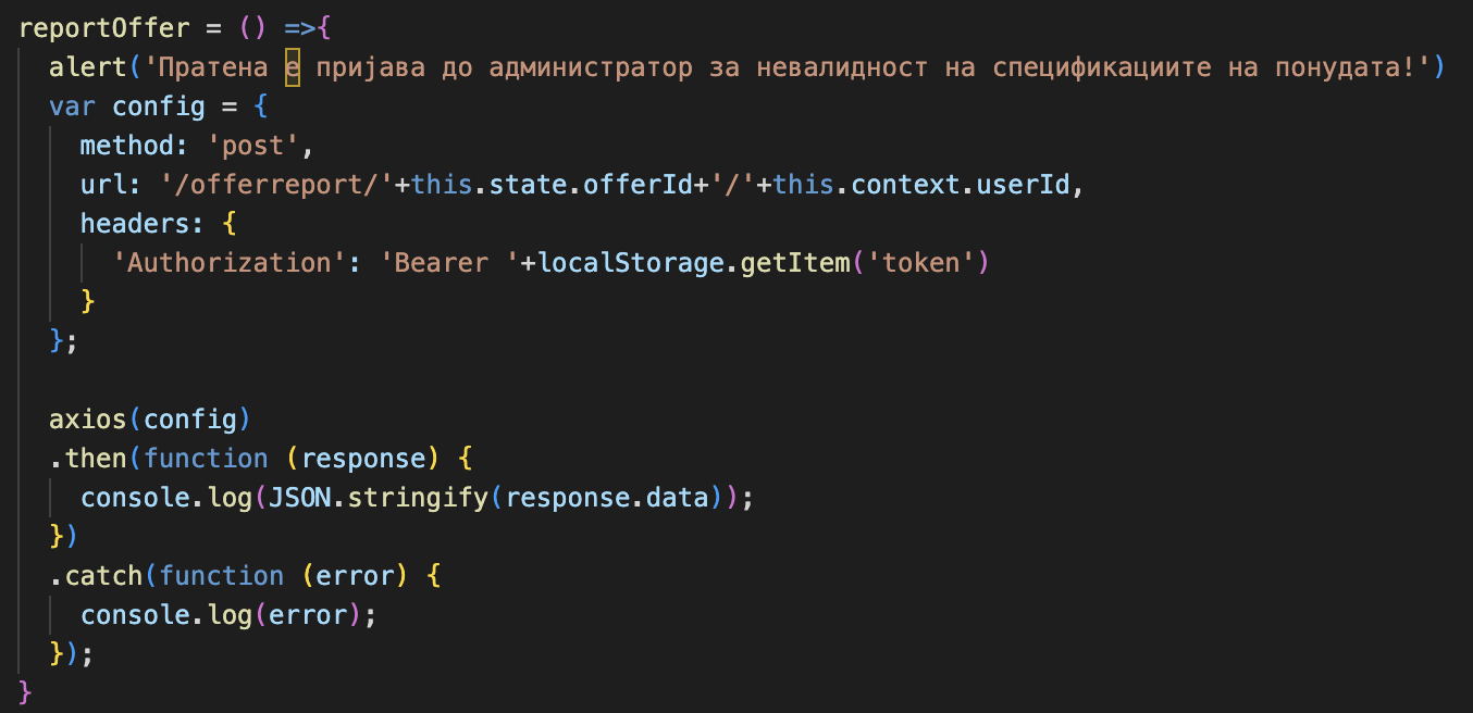 При клик на иконата за невалидни понуди, ќе бидеме редиректирани и ќе се прати GET барање до бекендот, каде што се земаат сите понуди кои што се пријавени и ќе се излистаат на страницата.