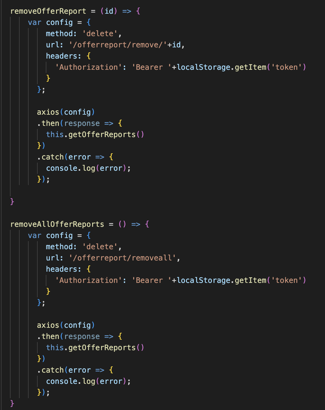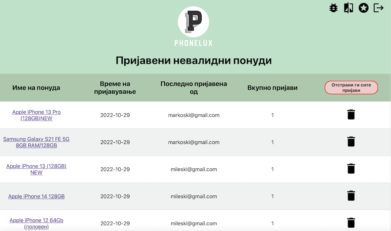 Притоа, доколку админот среди и валидира дадена понуда, и таа нема потреба да стои како пријавена, тој може да ја избрише. Тоа може да се направи на иконата што е како корпа, а исто така има опција доколку ги валидира сите, да ги изрише сите одеднаш. Истото се постигнува со праќање на DELETE requests до бекенд апликацијата.